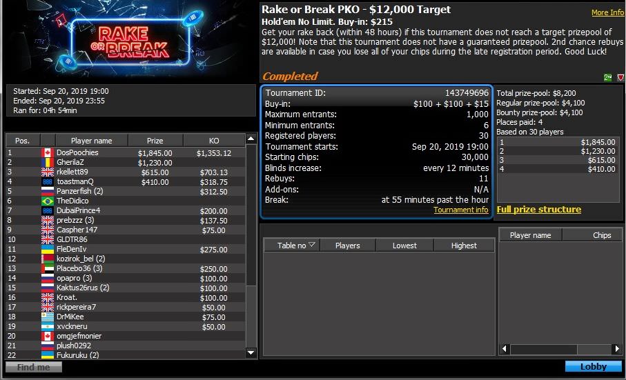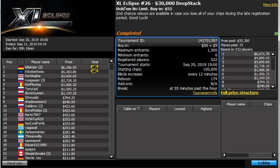 Dabei konnte sich mit „killakolor“ wieder einmal ein deutscher Spieler in die Siegerlisten eintragen. Bei Event 26, einem $55 Deep Stack, setzte er sich gegen 705 Konkurrenten durch und kassierte nach einem Deal mit dem Zweitplatzierten „rickybarbosa“ fast $6.200 Preisgeld.