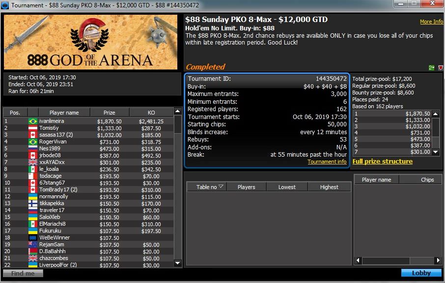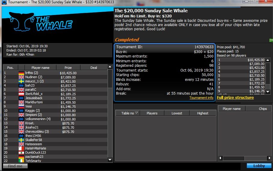 139 Entries nutzten die Gelegenheit, sich beim Sunday Sale Whale für $320 einzukaufen, sodass es letztlich um $41.700 Preisgeld ging.