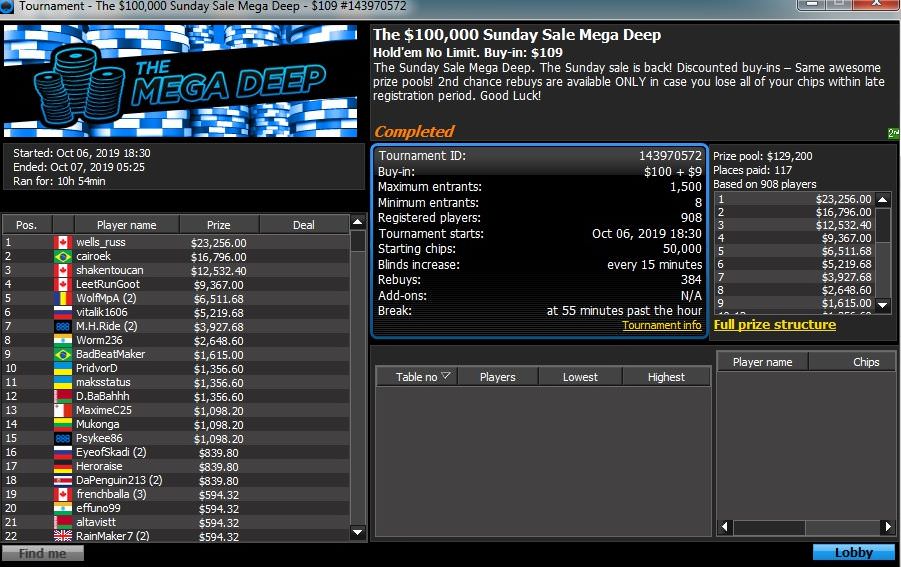 Sogar über $23.000 Preisgeld kassierte der Kanadier „wells_russ“, der sich beim Sunday Sale Mega Deep durchsetzen konnte.