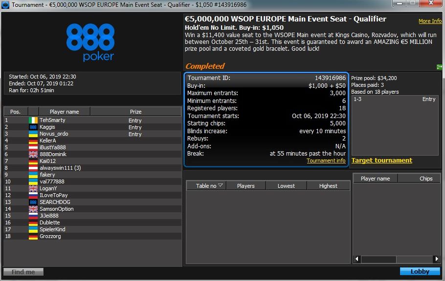Ausgespielt wurden zudem drei Tickets für den Main Event der WSOP Europe. „Novus_ordo“ und „TehSmarty“ schafften den Durchmarsch vom $109 Satellite über das $1.050 Satellite nach Rozvadov, außerdem wird „Kaggis“ Ende des Monats dabei sein.