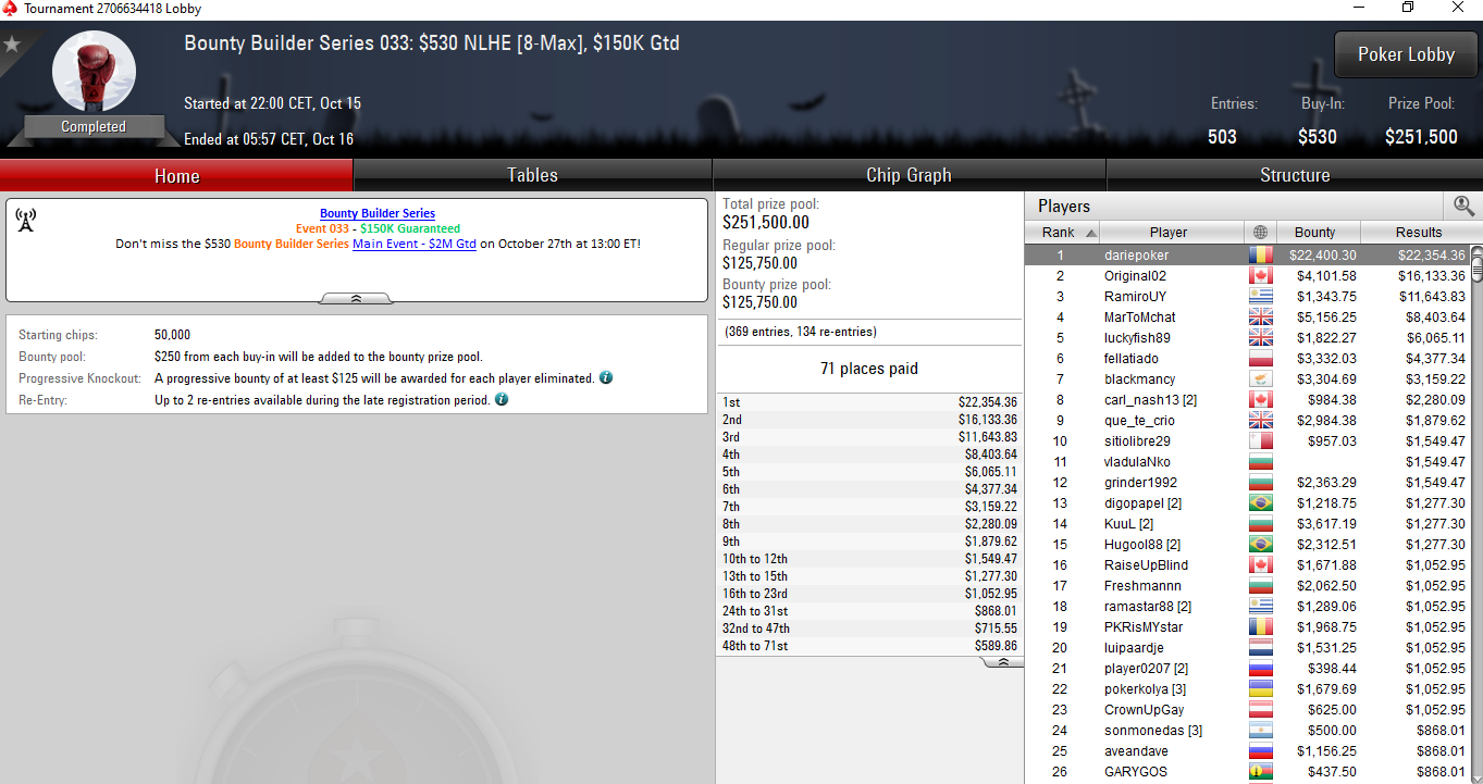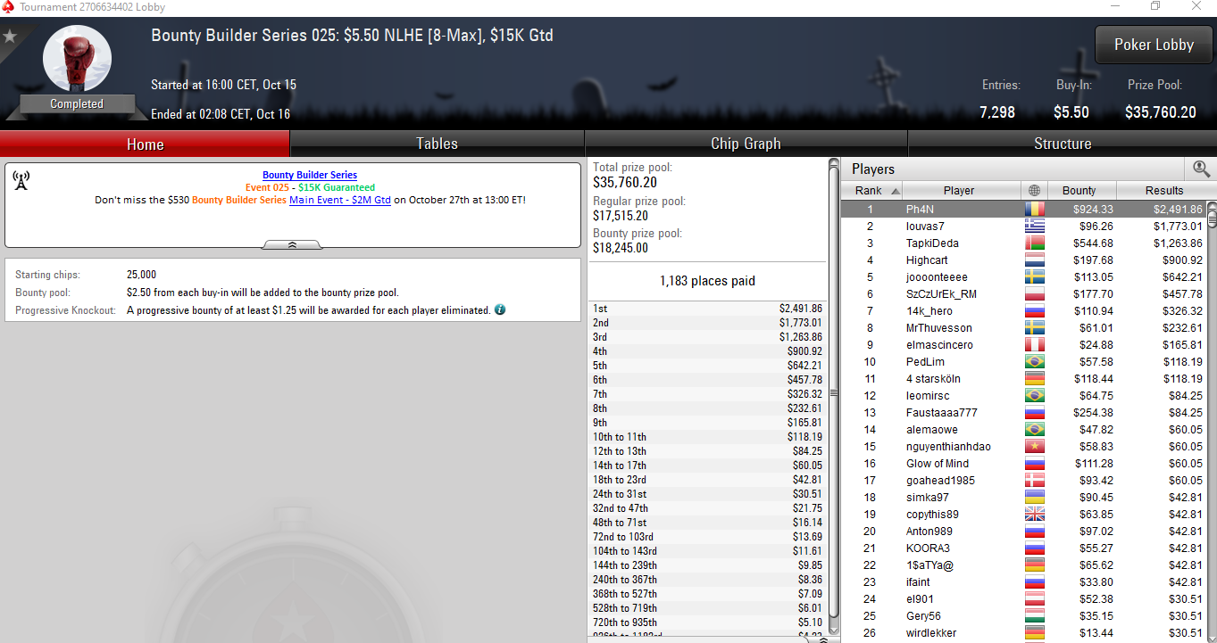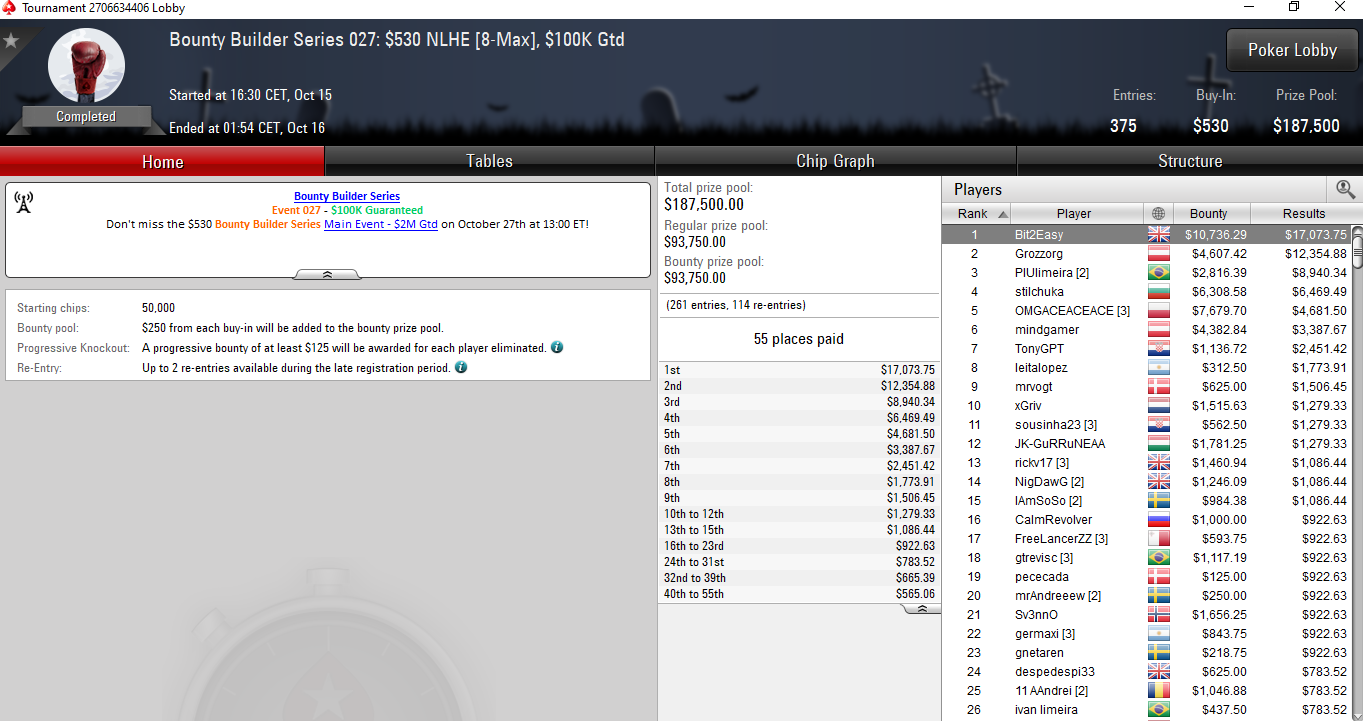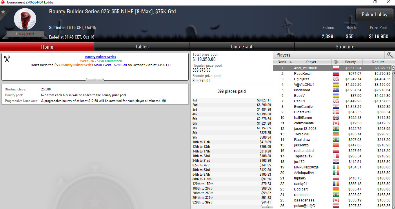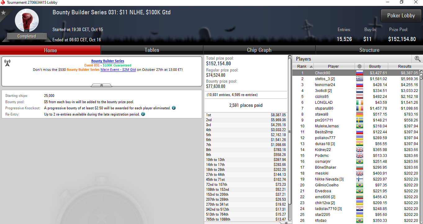 Auf PokerStars dreht sich aktuell alles ums „Ausknocken“. Bei der Bounty Builder Series werden jeden Tag Bounty Turniere mit hohen Garantien für jeden Geldbeutel angeboten, die für jede Menge Action sorgen. Gestern ging es in den dritten Tag und 12 Bounty Turniere standen auf dem Programm. Mit Buy-Ins zwischen $5,50 und $1.050 wurden Preispools mit insgesamt über 2 Millionen Dollar generiert.