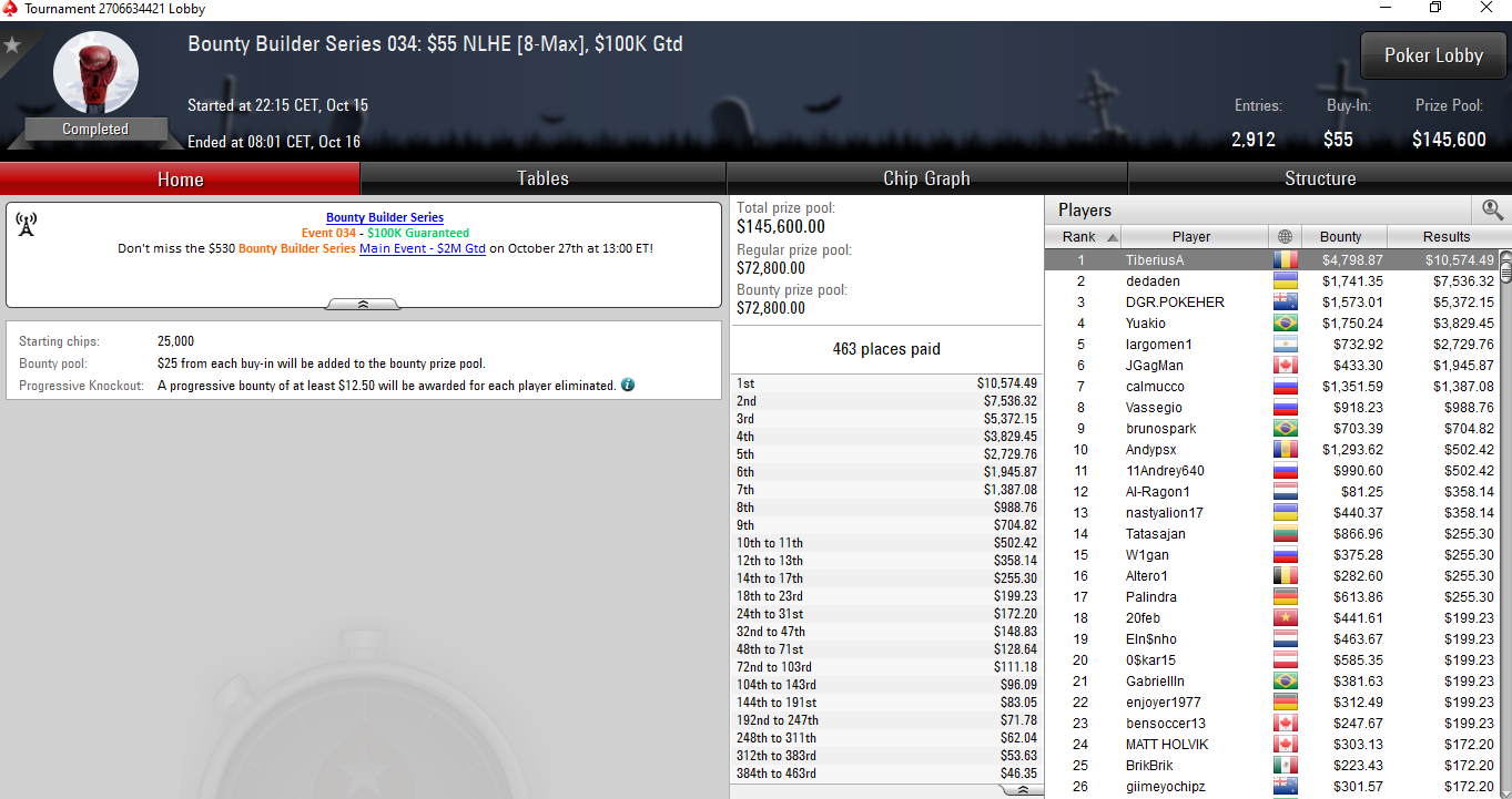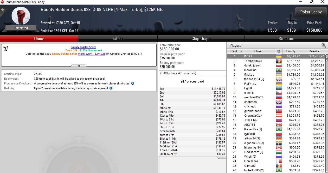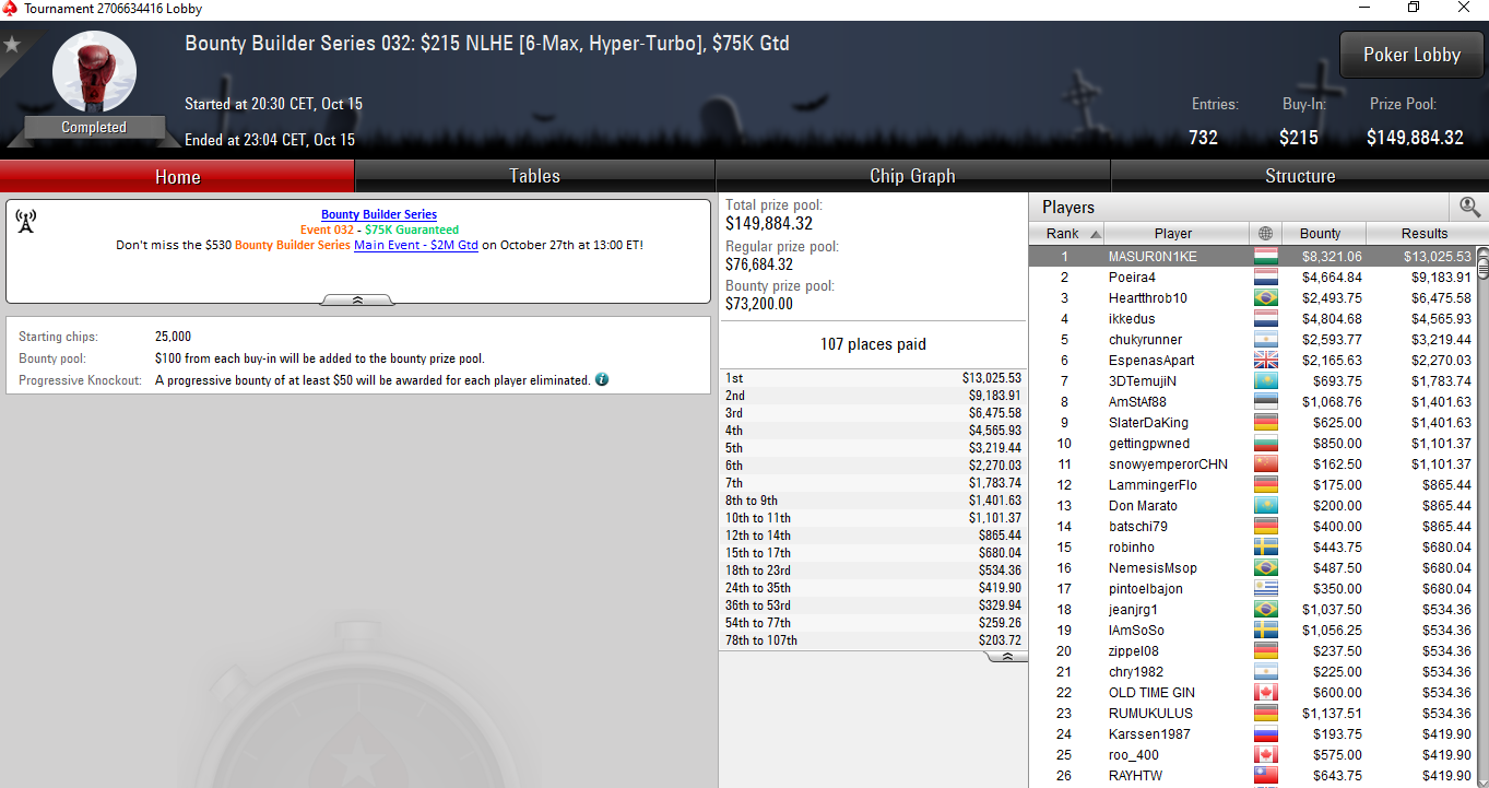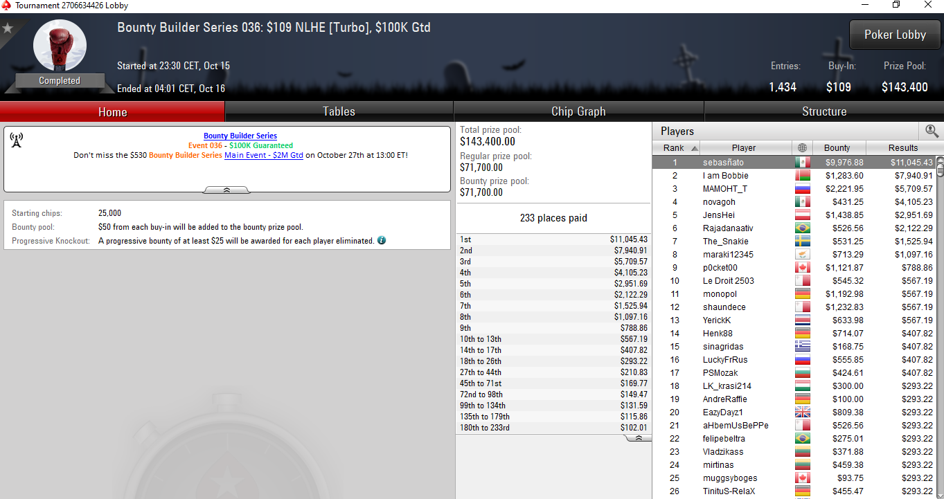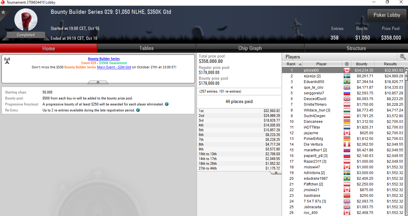 Auf PokerStars dreht sich aktuell alles ums „Ausknocken“. Bei der Bounty Builder Series werden jeden Tag Bounty Turniere mit hohen Garantien für jeden Geldbeutel angeboten, die für jede Menge Action sorgen. Gestern ging es in den dritten Tag und 12 Bounty Turniere standen auf dem Programm. Mit Buy-Ins zwischen $5,50 und $1.050 wurden Preispools mit insgesamt über 2 Millionen Dollar generiert.