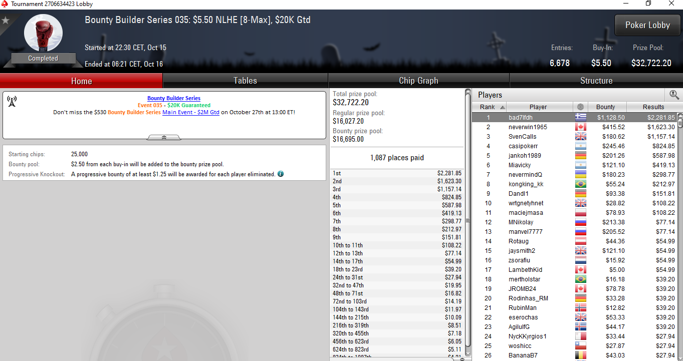 In den weiteren Turnieren konnten die DACH-Spieler noch einige Final Tables und gute Resultate erreichen. Bei Event #28 $109 4-Max Turbo erreichte „Ruffy_kid“ Platz 7 ($1.141,11 + $510,94). „stawal8“ musste den Final Table von Event #31 $11 auf Platz 8 verlassen ($783,16 + $517,15), nachdem er über 15.500 Spieler hinter sich ließ. Ebenfalls frühzeitig den Final Table verlassen musste „SlaterDaKing“ bei Event #32 $215 6-Max Hyper-Turbo auf Platz 9 ($1.401,63 + $625). In Event #35 $5,50 8-Max konnte man einen deutschen Doppel-Final Table erreichen. Jedoch war für „Dand1“ auf Platz 9 Schluss ($151,81 + $93,38) und „jankoh1989“ musste auf Platz 5 den Tisch verlassen ($587,98 + $201,26). Beim letzten Turnier des Tages, Event #36 $109 Turbo, schaffte es „JensHei“ unter die letzten fünf, musste dann jedoch den Traum vom Bounty Builder Titel begraben ($2.951,69 + $1.438,85).