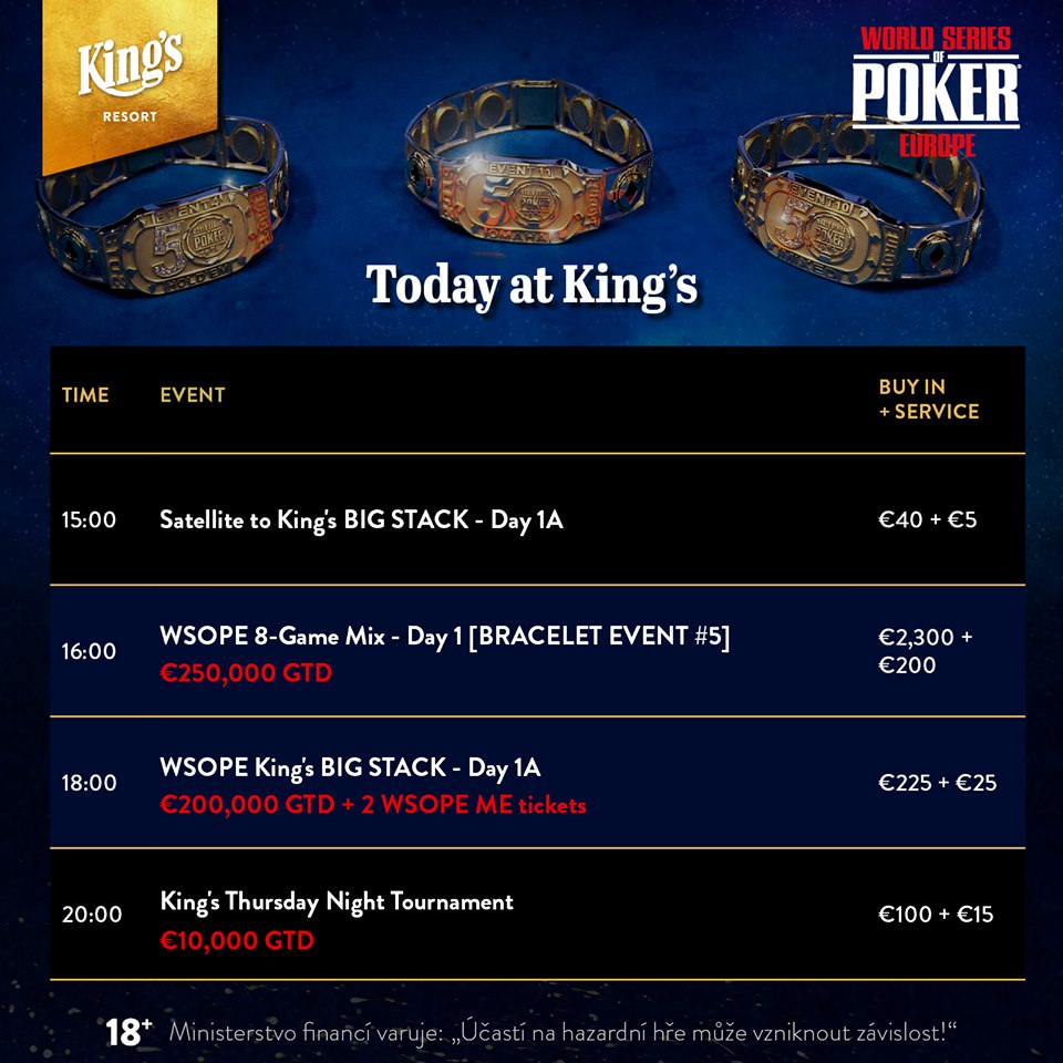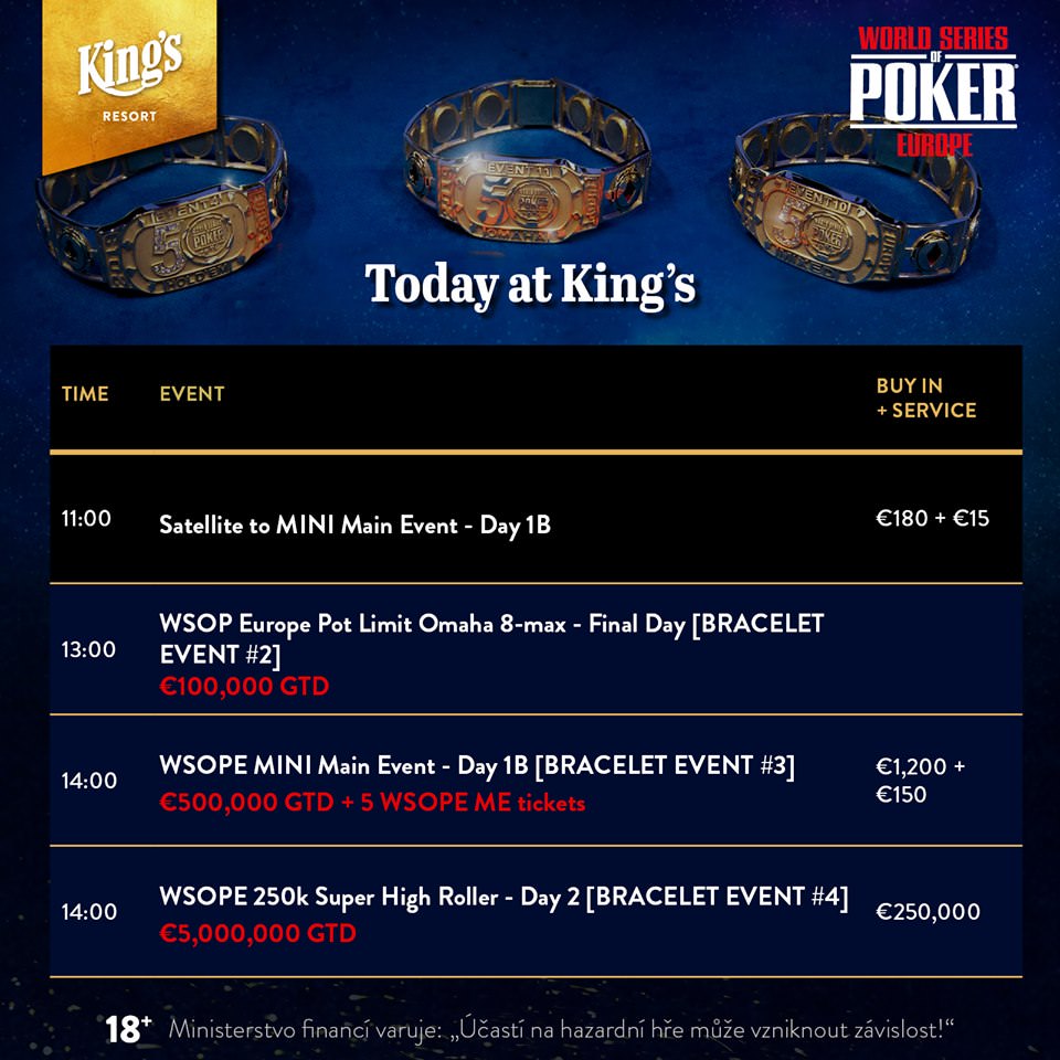 Der erste von sechs Starttagen Eins des €225+€25 WSOPE King’s Big Stack Event beginnt dann um 18:00 Uhr. Das Turnier garantiert ein Preisgeld von €220.700 (inklusive zwei €10.350 WSOP Europe Main Event Tickets). Es gibt eine Startdotation von 50.000 und man muss am Tag 1a insgesamt 16 Level à 30 Minuten überstehen. Zwei Re-Entries sind möglich und die Late-Registration ist bis zum Start von Level 13 geöffnet. Das Finale wird am Sonntag ab 15:00 Uhr gespielt.
