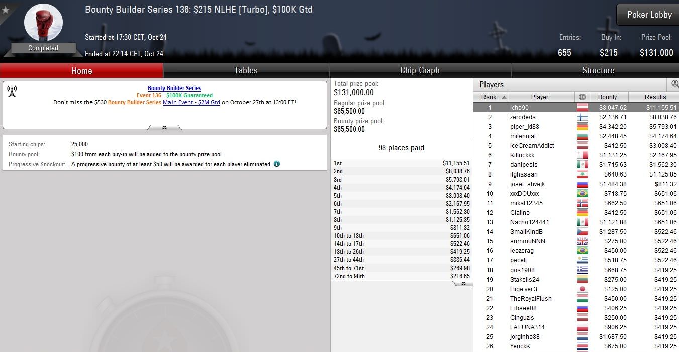 Einen deutschsprachigen Sieg gab es bei Event 136, wo „icho90“ alle 654 Konkurrenten hinter sich ließ und gut $19.000 Preisgeld abstaubte.