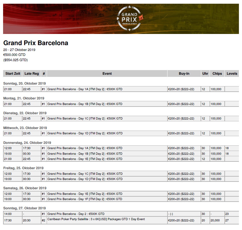 Ab 14:00 Uhr kommen heute alle Qualifikanten der 6 Live- und 5 Online-Starttage im Casino Barcelona zusammen und spielen um einen Prizepool von mindestens garantierten €500.000. Die Blinds beginnen bei 15.000/30.000 und dauern 30 Minuten in jedem Level an. Jeweils nach 5 Leveln gibt es eine Pause. Am frühen Montagmorgen werden dann die Finalisten und der Sieger feststehen.