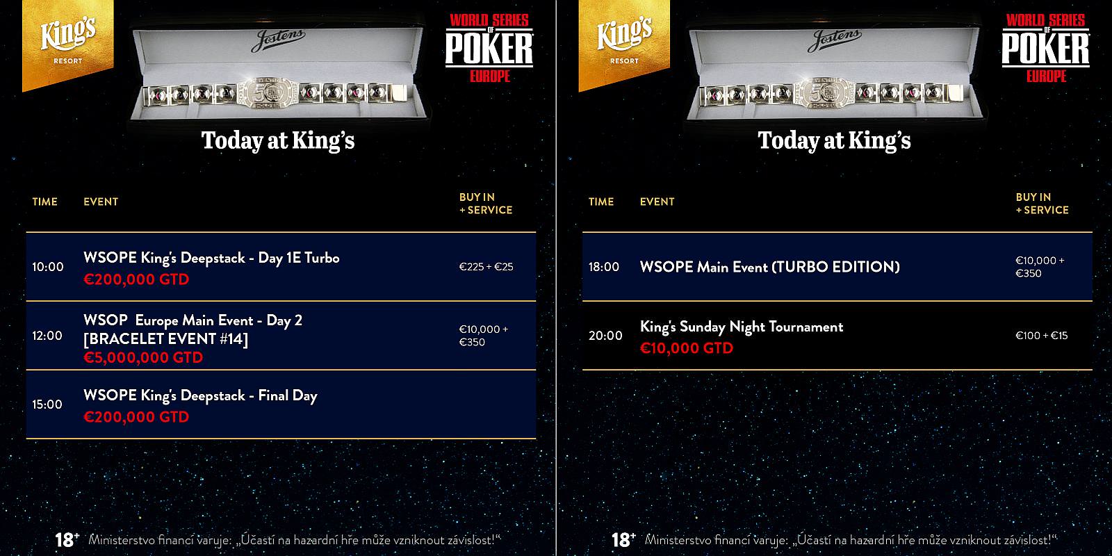 Auch heute stehen King’s wieder einige Höhepunkte an. Neben Tag 2 des WSOPE Main Events wird der Finaltag des WSOPE Deepstack ausgetragen. Das €115 Sunday Night Tournament darf natürlich auch nicht fehlen, es startet um 20 Uhr!