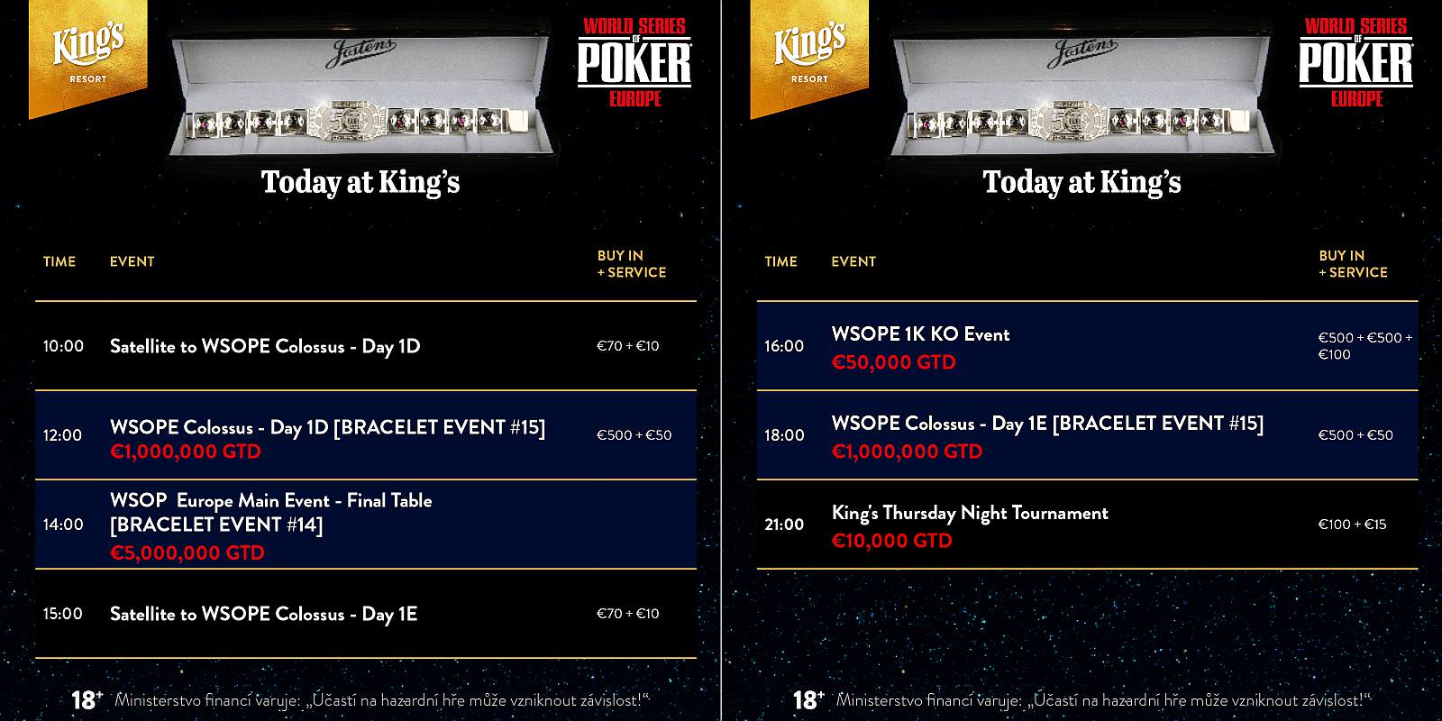 Am heutigen Donnerstag stehen neben dem mit Spannung erwarteten Finale des Main Events der WSOPE auch die Starttage 1D und 1E des €550 WSOPE Colossus an.