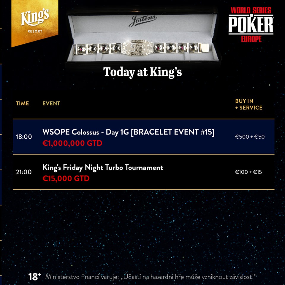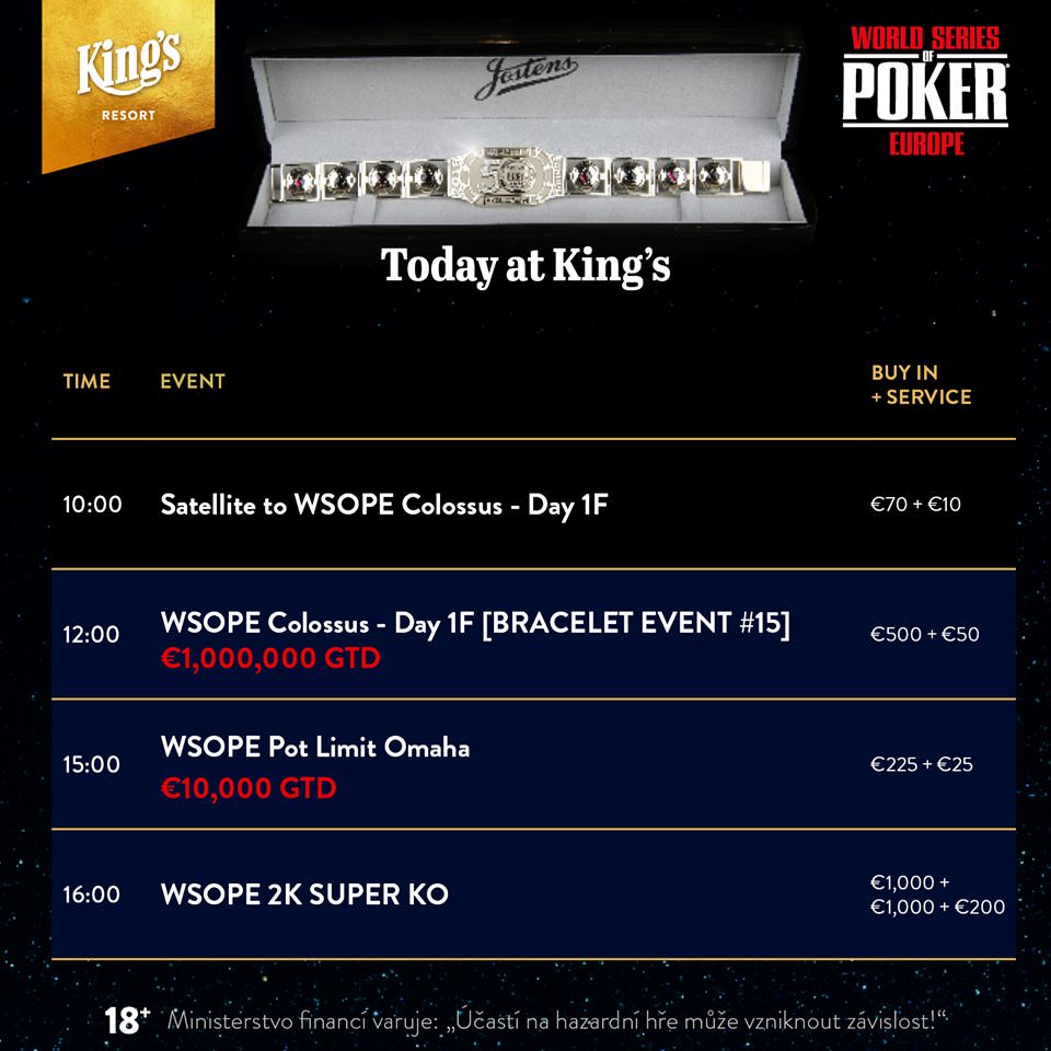 | Fri 01.11. 12:00 | WSOPE Colossus - Day 1F [BRACELET][EVENT][#15] | 1.000.000 EUR | 500 EUR | 50 EUR |