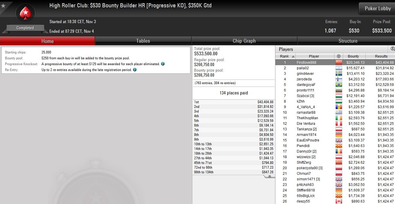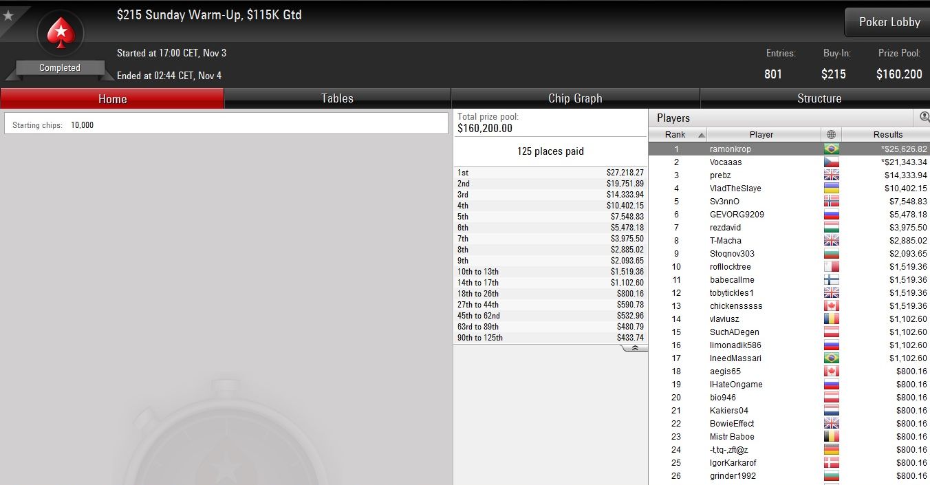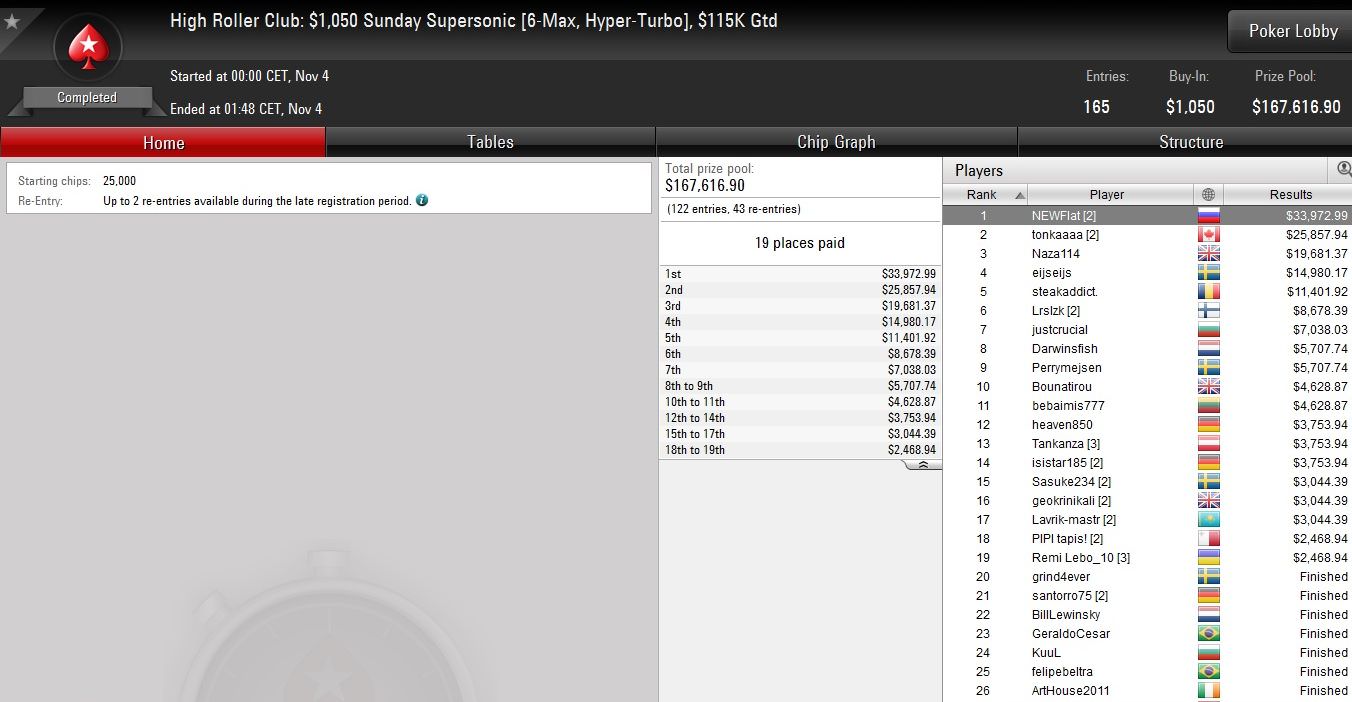 Sieger und einziger sechsstelliger Gewinner von gestern wurde der Brite „Ben_Apart“, der sich über mehr als $119.000 Preisgeld freuen durfte. Auf Rang 3 landete mit „JulianPasare“ der beste Deutsche, der $69.000 abräumte.