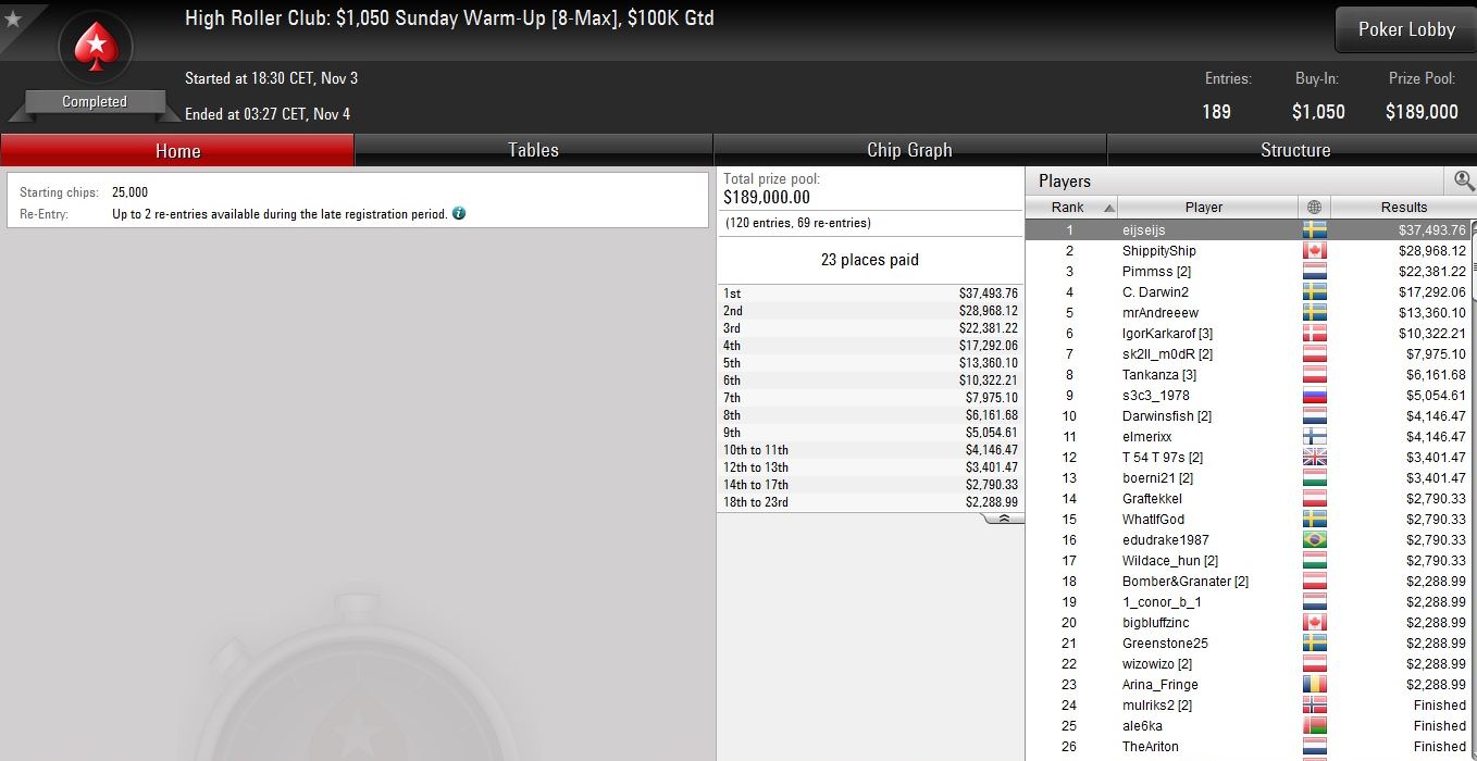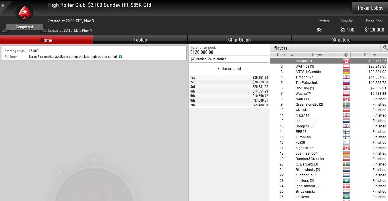 Beim Sunday Highroller belegten Christian „WATnlos“ Rudolph und „ARTSchGamble” die Plätze 2 und 3 und mussten sich nur dem Kanadier „maxtack11“ beugen.