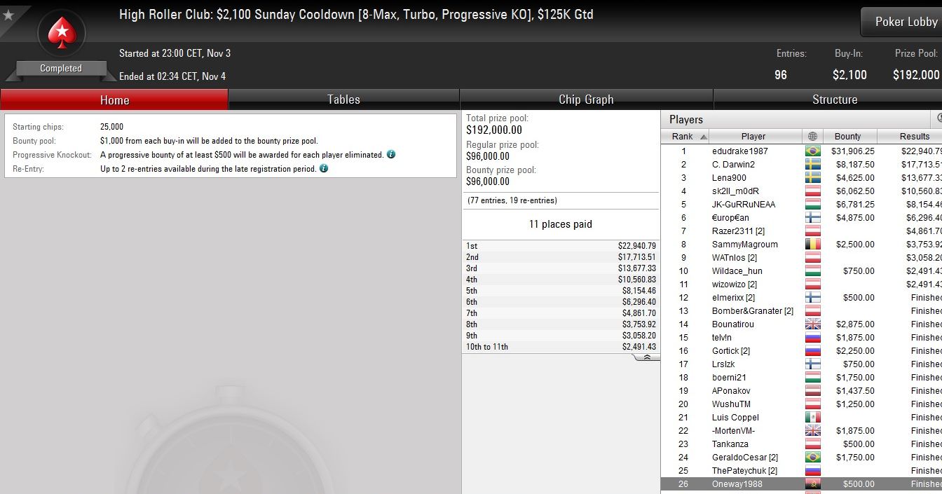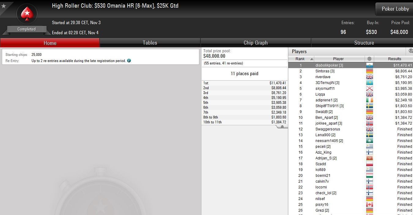 Ebenfalls Zweiter wurde „Sintoras“ beim $530 Omania Highroller und Oliver „sk2ll_m0dR“ Weis rundete die gute deutschsprachige Bilanz mit einem vierten Platz beim $2.100 Sunday Cooldown ab.