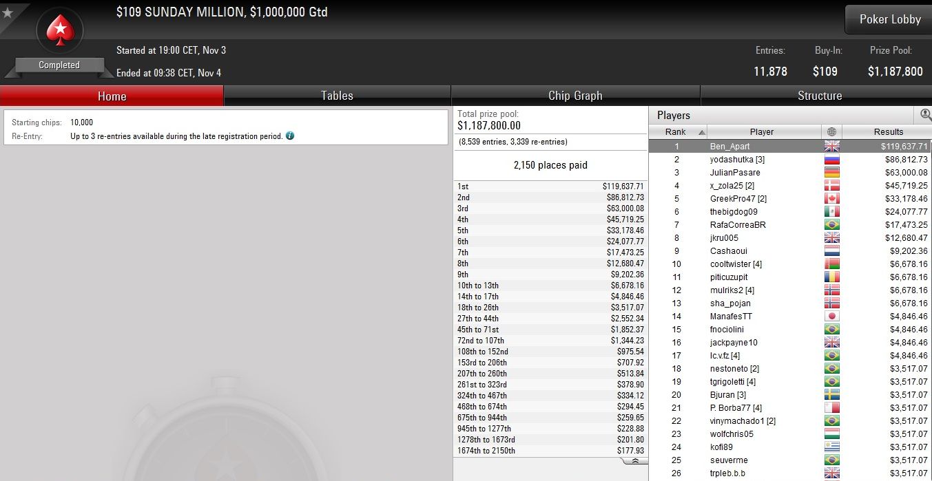 Bei der $109 Sunday Million wurden 11.878 Entries verbucht, womit die ausgelobte Garantie wieder einmal sicher übertroffen wurde.
