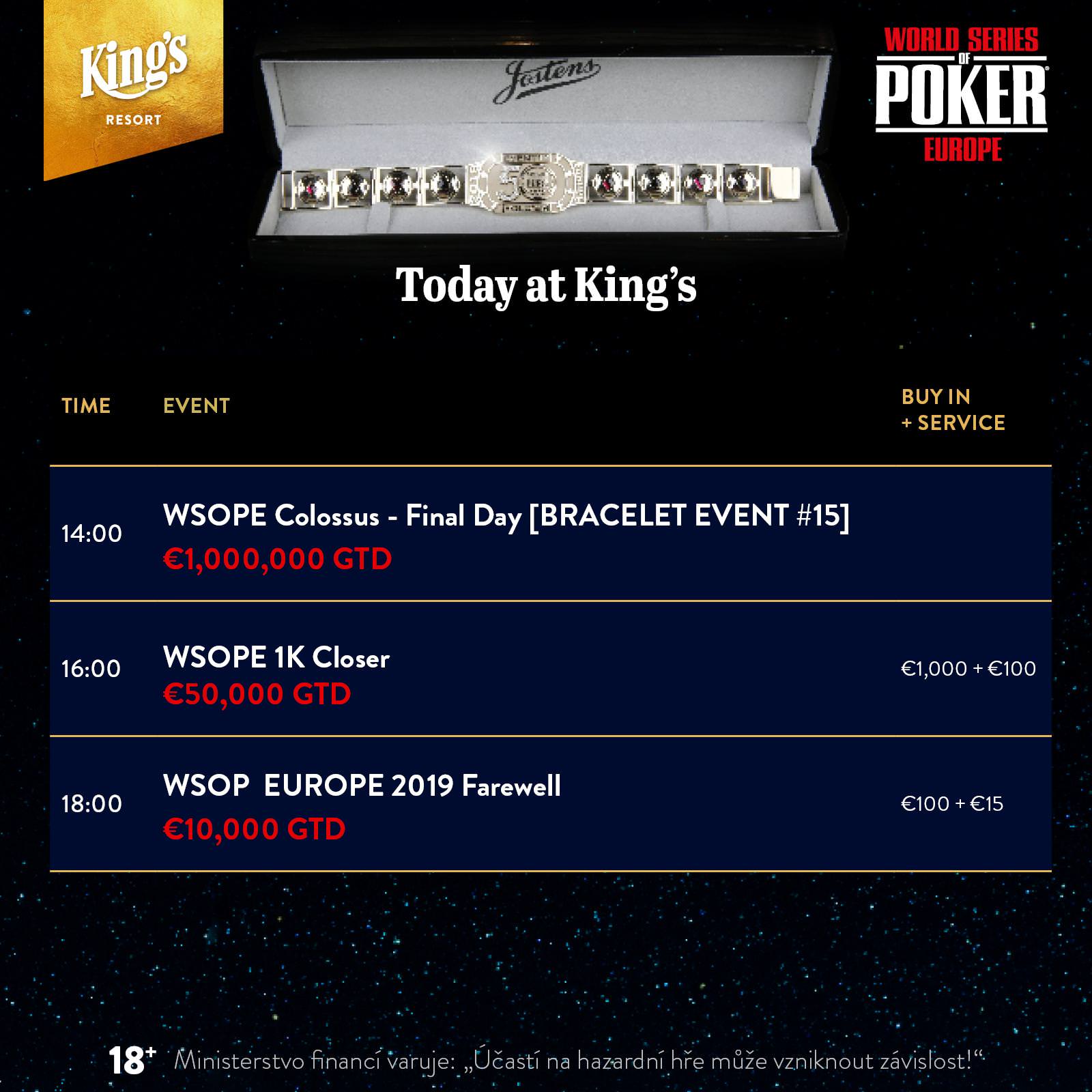 Am Schlusstag der WSOP Europe stehen noch einmal zwei Side Events an. Um 16 Uhr beginnt der 1k WSOPE Closer mit einer Garantie von €50.000 und um 18 Uhr startet das €115 WSOPE Farewell.