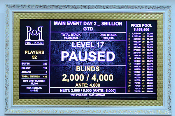 Am Montag geht mit Tag 3 im Level 18 bei Blinds 2.500/5.000 (Big Blind Ante) weiter. Der Average beträgt 209.615 (42 Big Blinds). Das Finale findet dann erst am Dienstag statt.