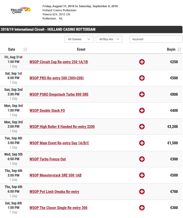 Vom 14. bis 22. November wird das Holland Casino Rotterdam wieder Austragungsort des World Series of Poker (WSOP) International Circuits sein. Das Festival bietet holländischen, und natürlich auch Spielern aus den Nachbarländern, 14 Mal die Möglichkeit, auf WSOP-Ring-Jagd zu gehen. Dass für DACH-Spieler Holland ein gutes Pflaster ist, zeigte im Main Event 2017 Eyal Bensimhon (Österreich), der vor Jakob Miegel (Deutschland) landete. 2018 war dann der Niederländer Tobias Peters erfolgreich. Direkt im Anschluss an das Festival finden im übrigen die Master Classics of Poker im Holland Casino statt.