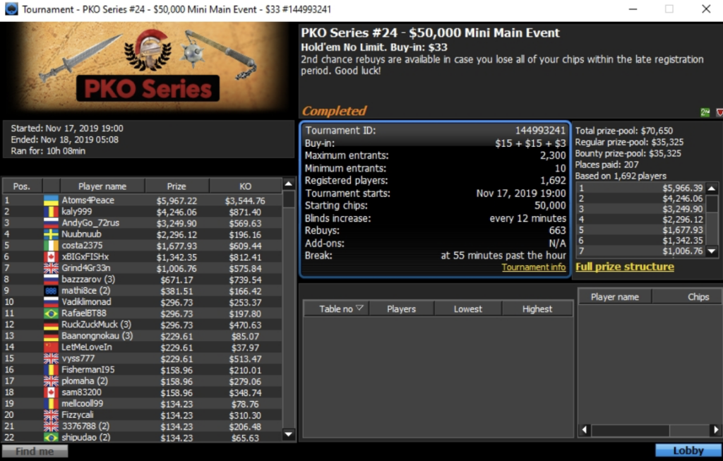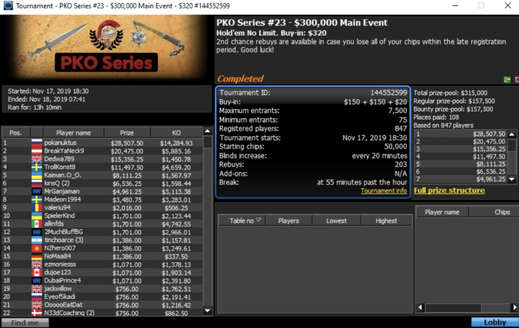 Das absolute Highlight dieser PKO Series war das $300.000 GTD Main Event. Da sich 847 Spieler für $320 einkauften ging es am Ende um $315.000, wovon wie üblich bei PKO Turnieren 50% als Bounties ausbezahlt wurden. Im Heads-Up saßen sich der Russe “pokanuktus“ und der Österreicher “BreakYaNeck9” gegenüber. Am Ende musste sich “BreakYaNeck9” als Runner-Up mit $20.475 plus $5.885,16 zufriedengeben. Für den Sieger aus Russland gab es $28.507,50 plus $14.284,93 an Bounties.