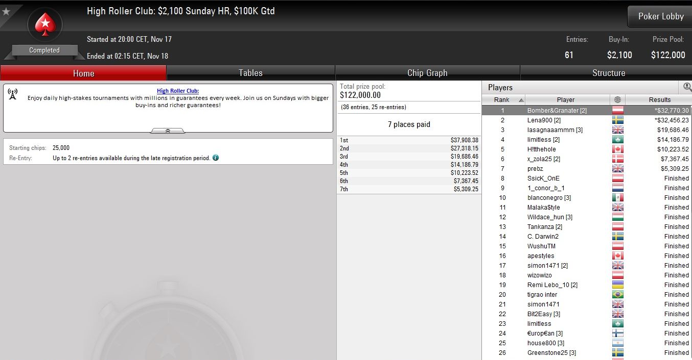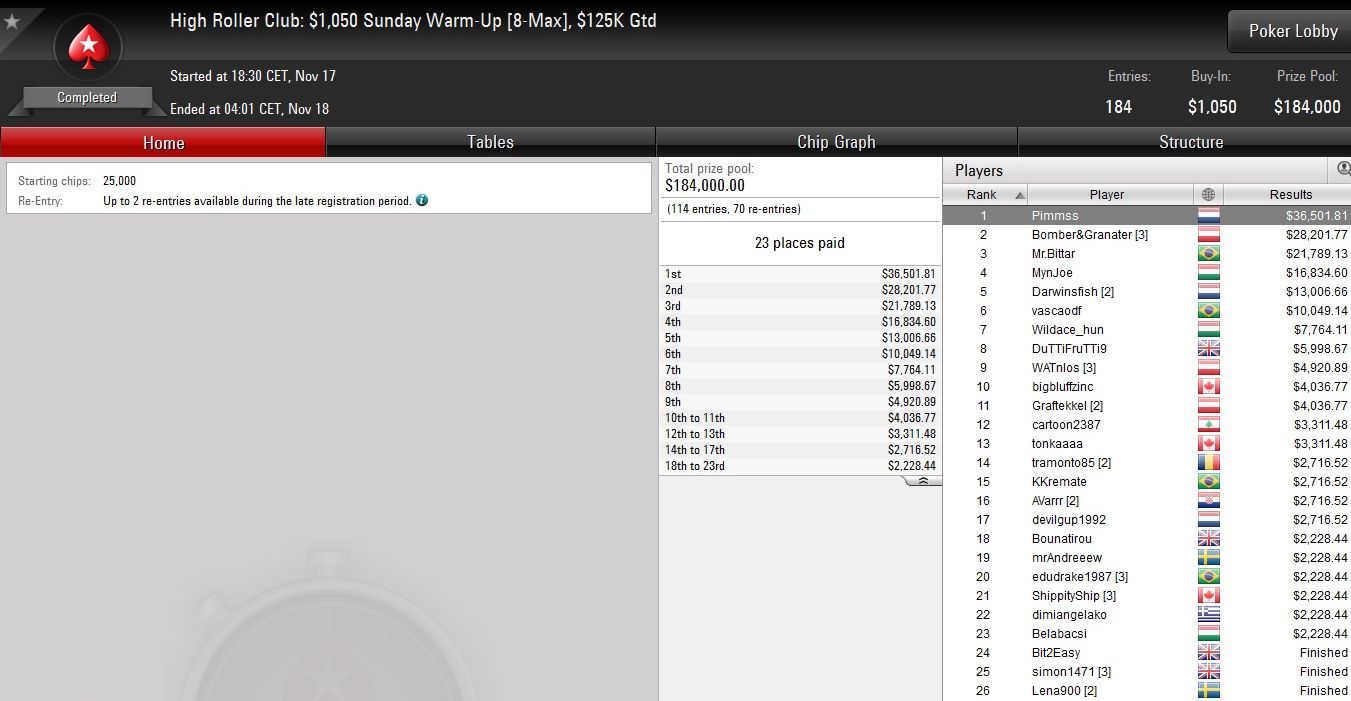 Nach Platz 2 beim $1.050 Highroller Warm-Up folgte ein geteilter Sieg beim $2.100 Sunday Highroller, ehe der unfassbare Abend mit Platz 4 beim $1.050 Sunday Cooldown und Platz 2 beim $530 Sunday Supersonic kaum minder erfolgreich zu Ende ging.