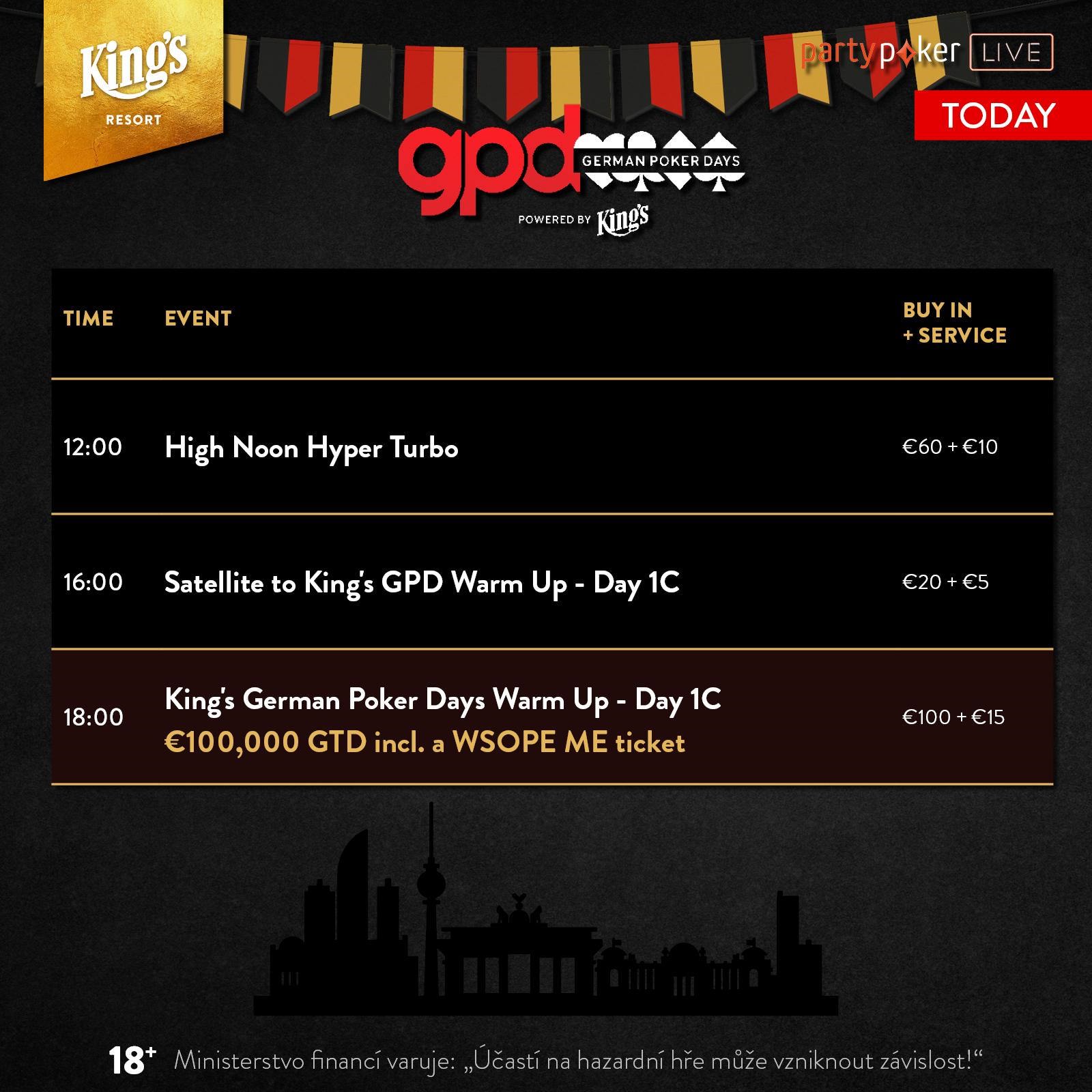 | Thu 21.11. 11:00 | King's German Poker Days Warm Up - Day 1E Turbo | 100.000 EUR | 100 EUR | 15 EUR |