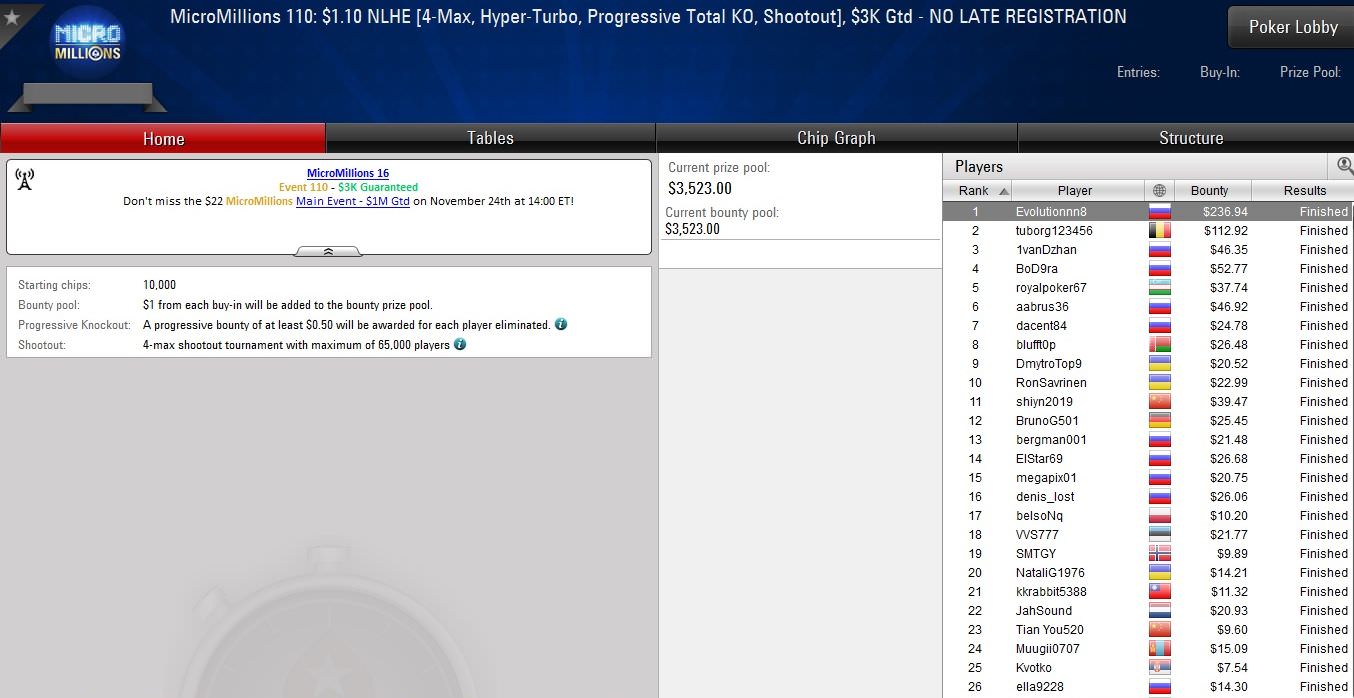 Einen Deal gab es bei Event #113, einem $3,30 PLO Hi/lo. „op66po“ aus Polen und „Vasiachiki“ aus der Ukraine kassierten jeweils über $2.300 und gehörten damit ebenfalls zu den größten Gewinnern des Tages.