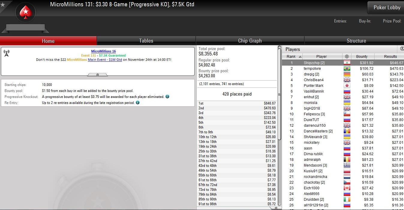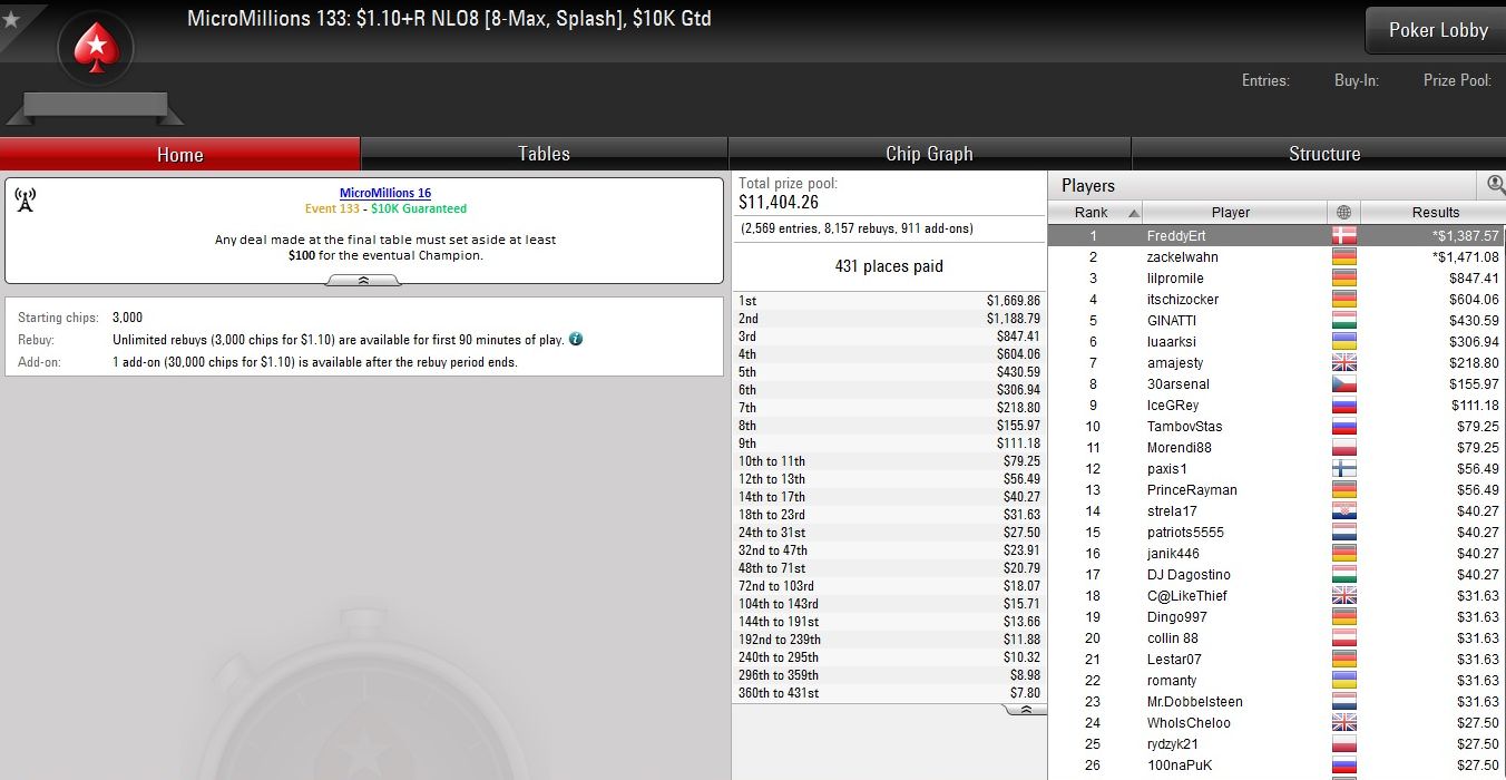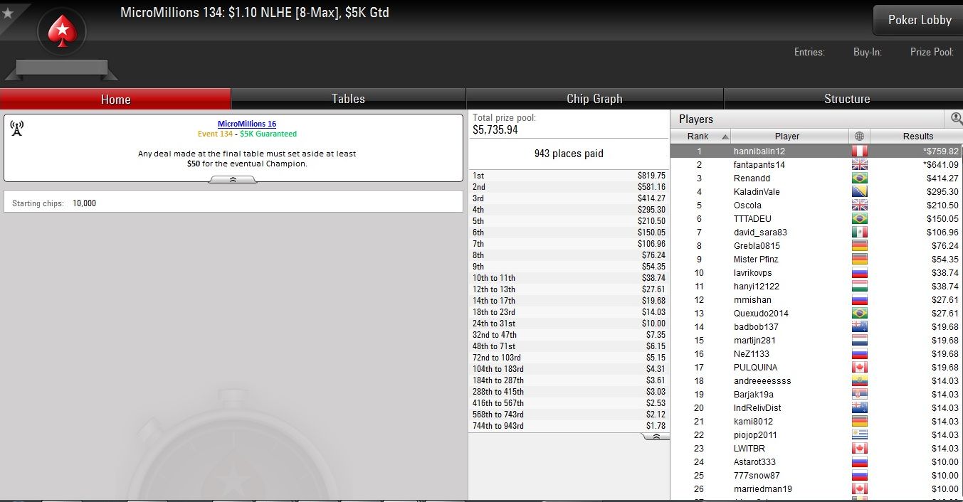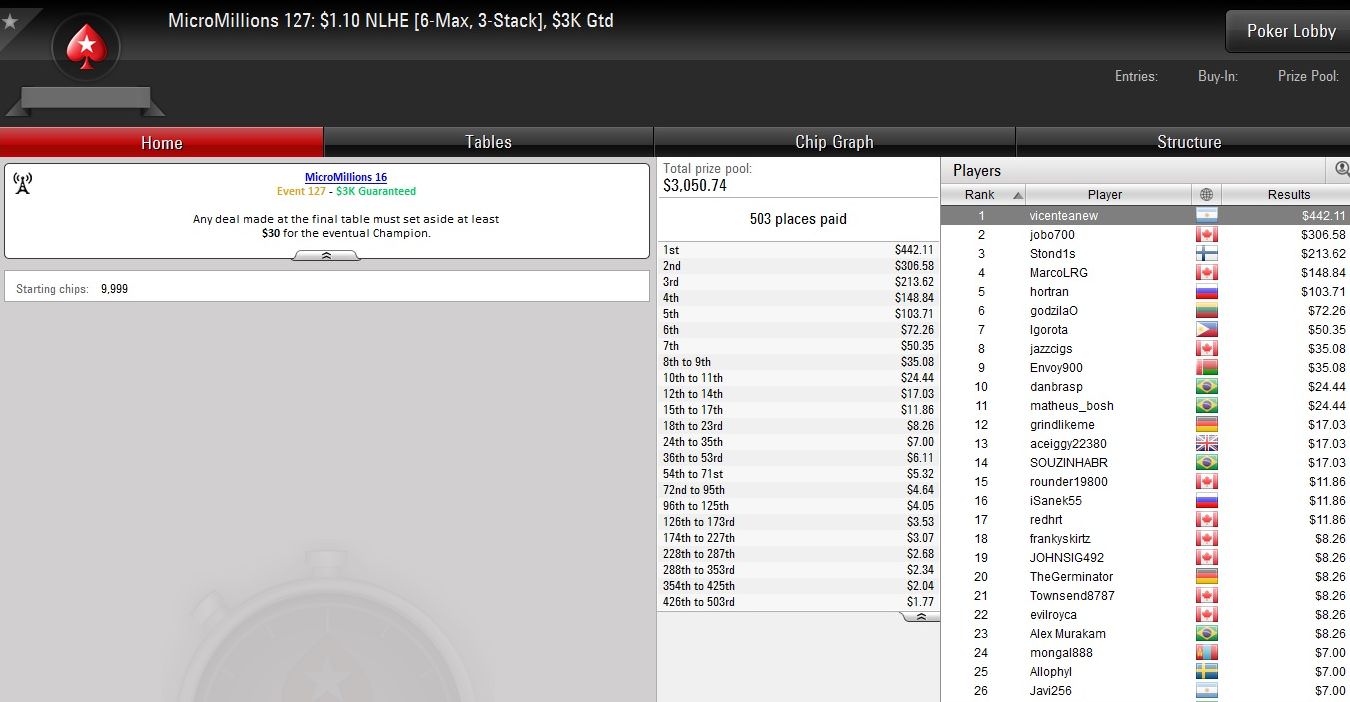 Am vorletzten Tag der Micro Millions auf PokerStars wurden erneut zehn Turniere mit Buy-Ins von $1,10 bis $5,50 ausgetragen.