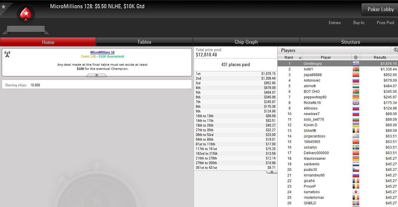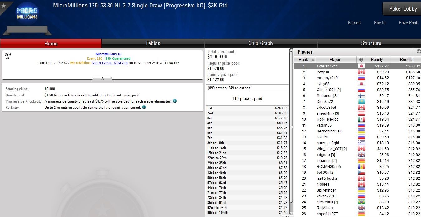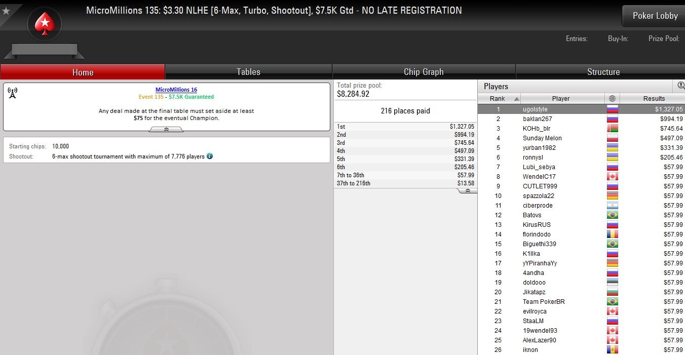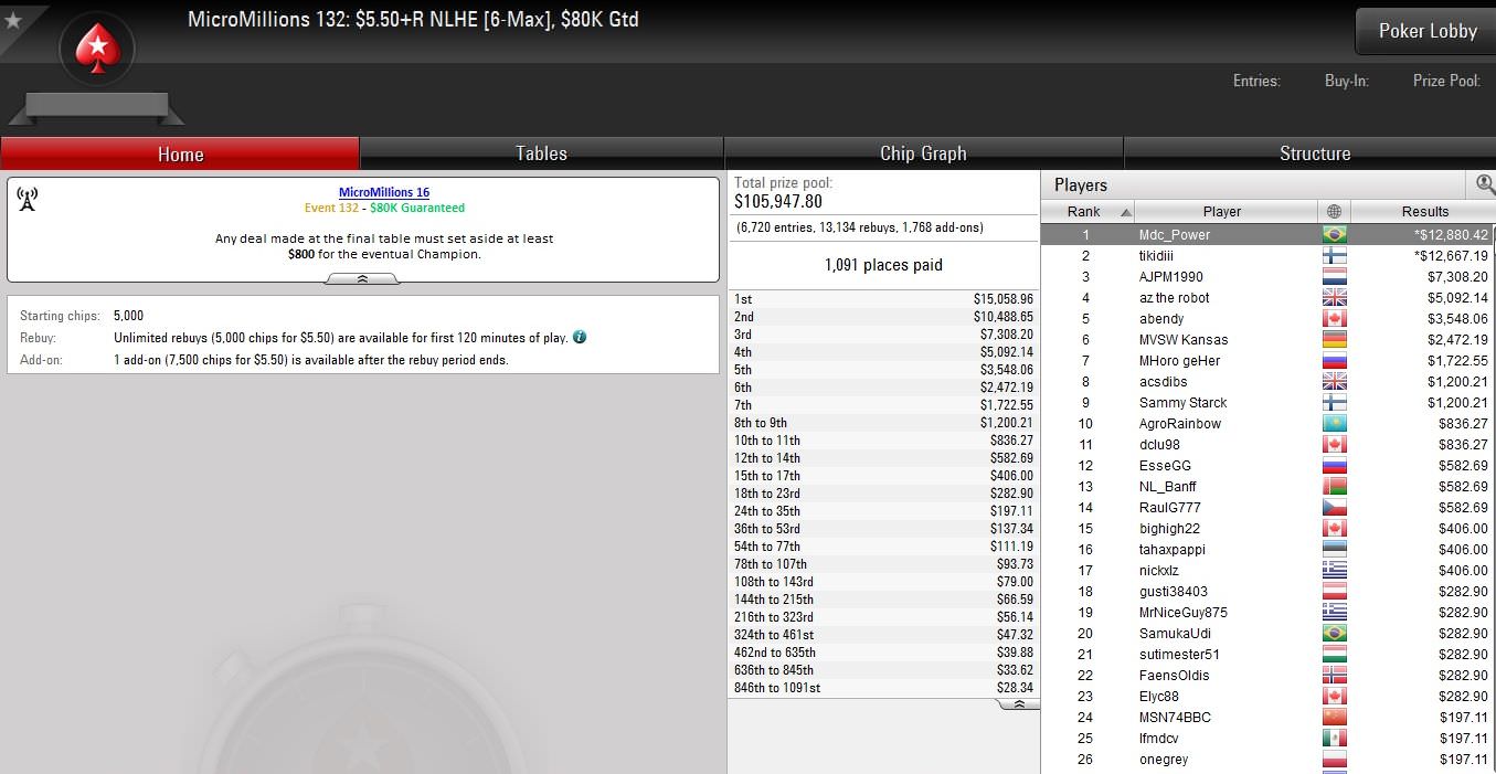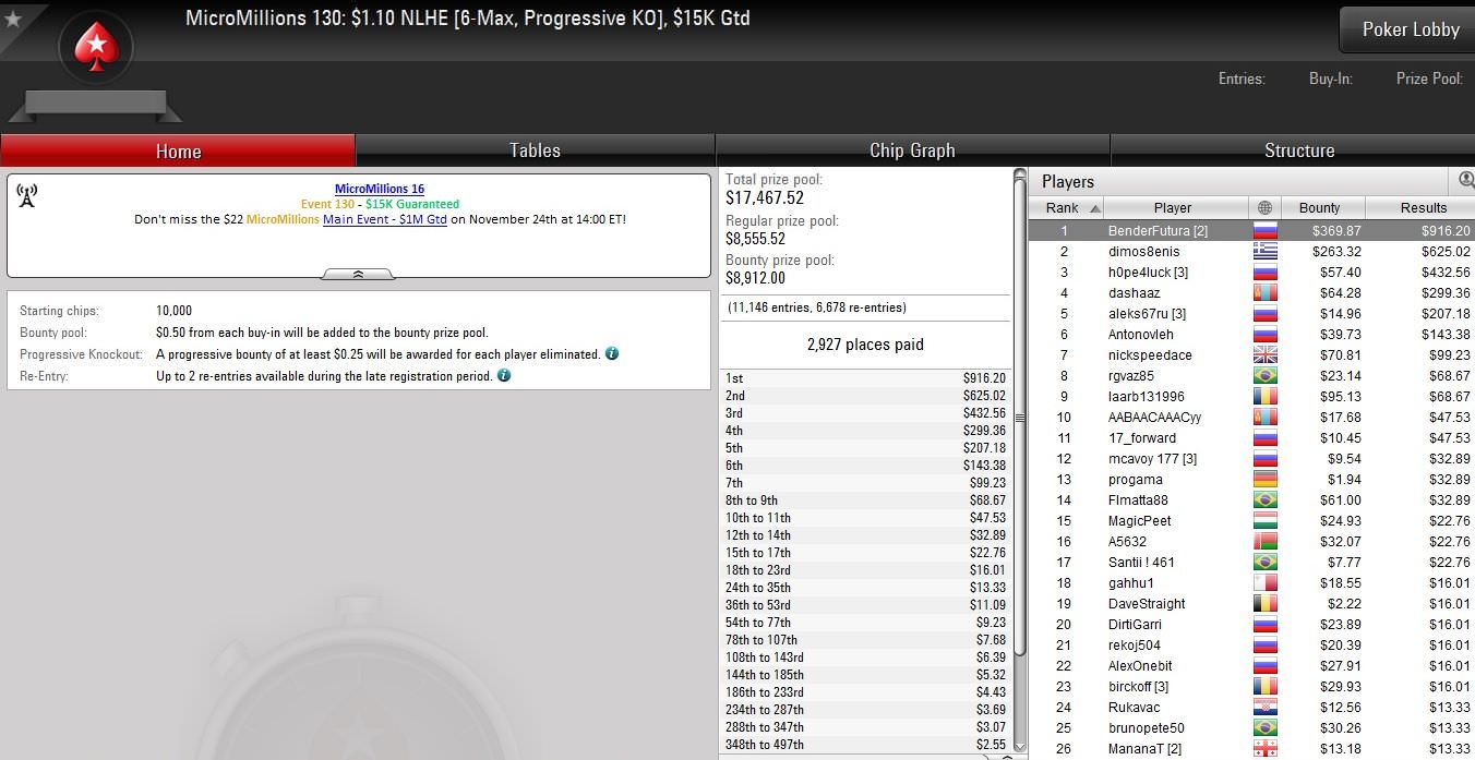 Am vorletzten Tag der Micro Millions auf PokerStars wurden erneut zehn Turniere mit Buy-Ins von $1,10 bis $5,50 ausgetragen.