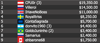 Eines der Highlights beim gestrigen Sunday Grind auf 888poker war das $215 Mega Deep, und mit 330 Buy-ins und 116 Re-Entries kam es zu einem kleinen Overlay und wurden die garantierten $100.000 ausgespielt. Nach etwas mehr als 10 Stunden kam es im Heads-Up zwischen „CPU0r“ aus Österreich und dem Russen „Villeroi“ zur entscheidenden Hand und der Sieg ging an den Österreicher für stolze $19.350. Als Runner-Up erhielt “Villeroi” immerhin noch $14.500.