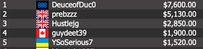 Beim teuersten Event am gestrigen Abend, dem $530 Rake or Break Whale waren $25.000 als Ziel vorgegeben. Sollte wie bei Rake or Break Turnieren auf 888poker üblich diese Summe nicht erreicht werden erhalten alle Teilnehmer ihr Rake zurück. Mit 29 Entries und nur neun Re-Entries waren es am Ende $19.000, wodurch alle Spieler das bezahlte Rake retourniert bekommen. Auch der 888poker Pro Dominik Nitsche kaufte sich in das High Roller Turnier ein, musste sich aber leider vor den bezahlten Plätzen verabschieden. Den Sieg für $7.600 sicherte sich “DeuceofDuc0” vor “prebzzz” als Runner-Up für $5.130.