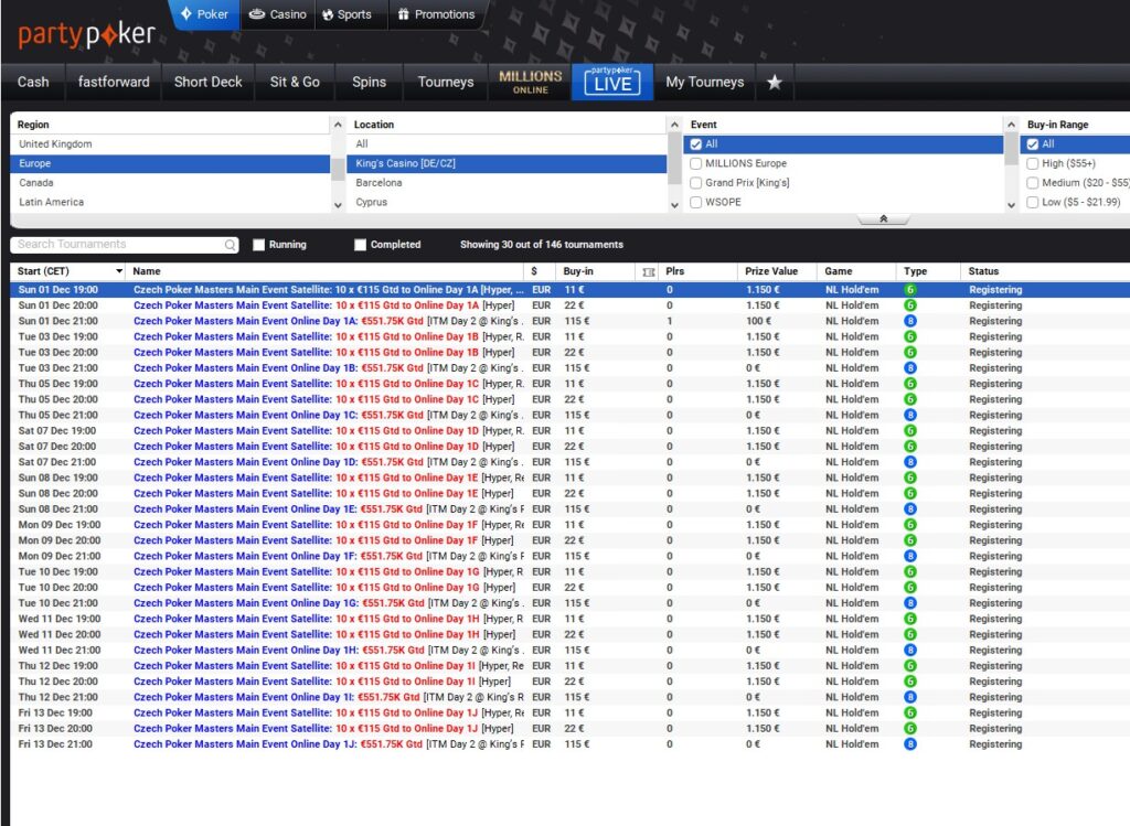 | Mon 09.12. 16:00 | Satellite to Czech Poker Masters ME - Day 1B | 1.150 EUR | 25 EUR | 5 EUR |