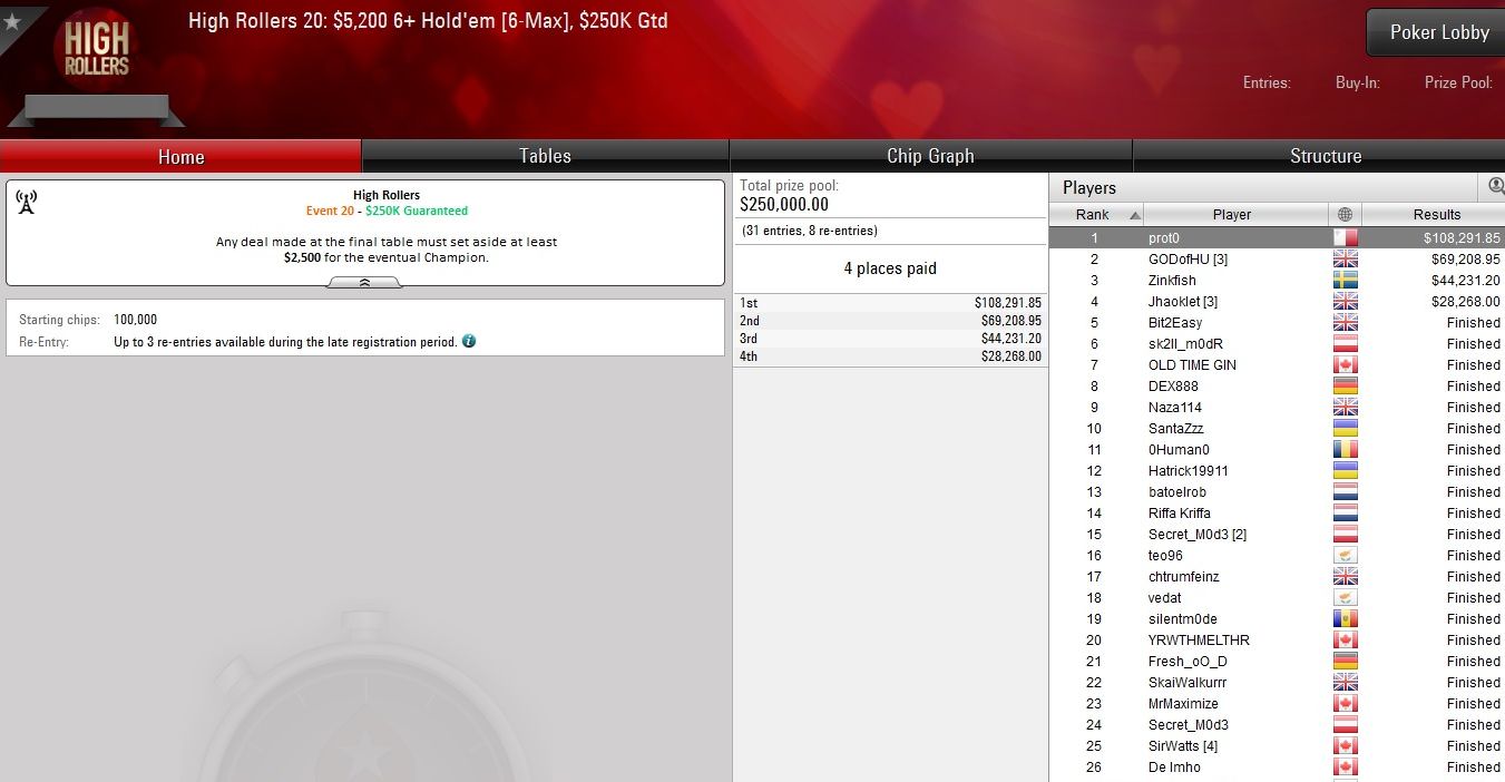 Das $5.200 Short-Deck-Event #20 wurde eine Beute von Jordi „prot0“ Urlings. Der Niederländer setzte sich im Heads-Up gegen den selbsternannten „GODofHU“ durch und erhielt dafür über $108.000 Preisgeld.