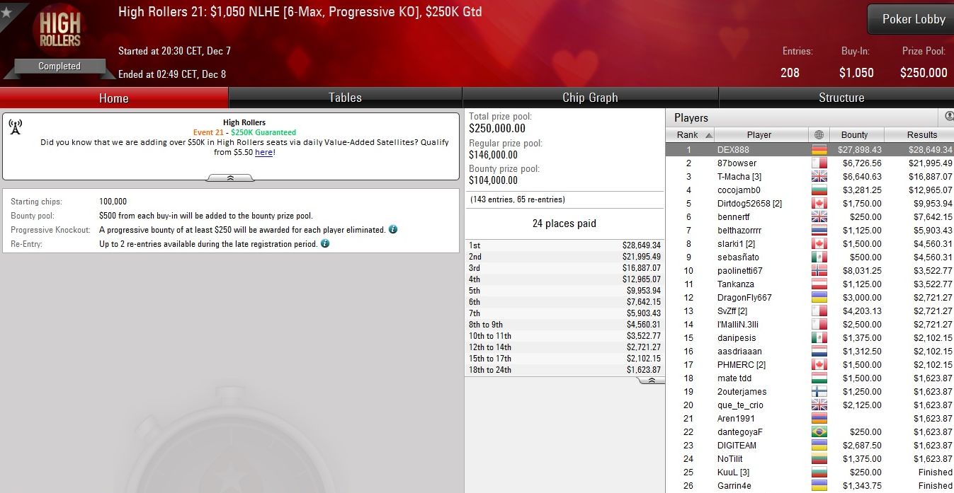 Einen deutschen Sieg gab es aber trotzdem. Bei Event #21, einem $1.050 NLHE, blieb man mit 208 Entries ebenfalls unter der Garantie, doch „DEX888“ juckte das wenig. Er setzte sich gegen alle Konkurrenten durch und räumte über $56.000 ab. „T-Macha“ als Dritter rundete das gute deutsche Ergebnis ab.