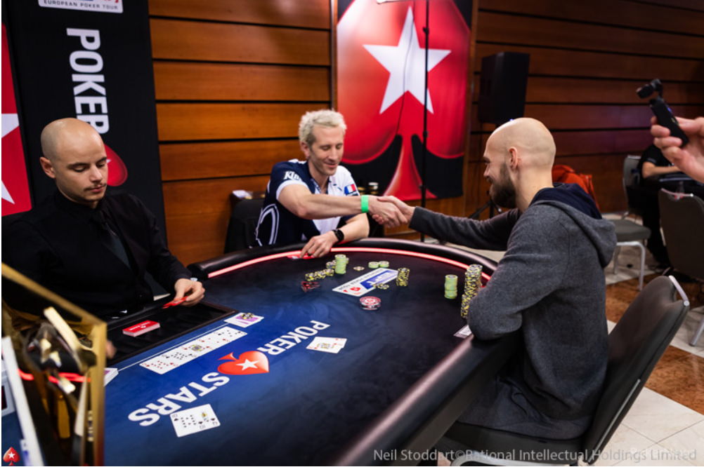 Adrian Mateos der als Chipleader und frischgekürter €10.300 EPT High Roller Champ in den Finaltag gegangen war, konnte oder musste sich weitgehend aus allen Schlagabtäuschen heraushalten. Erst jetzt griff er mit all seinen Chips ins Geschehen ein. Das erste Mal erfolgreich, als er am Turn gegen „ElkY“ seinen Double-Gutshot-Straight-Draw pushte und dieser nach dem Call des Franzosen auch ankam. Das zweite Mal mit fatalem Ausgang, als er mit
