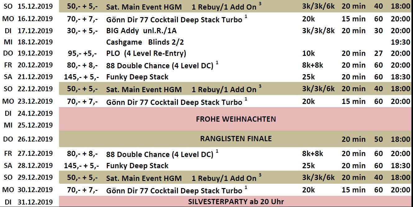 Dreimal wird im Casino Schenefeld vor Weihnachten noch gepokert. Heute findet traditionell das €145+€5 Funky Deep Stack statt, ehe am Sonntag das nächste Satellite zum Main Event der Hochgepokert Masters auf dem Turnierplan steht. Alle Infos zum Ende von 2019 findet ihr am Ende des Artikels oder auf der Homepage des Casinos Schenefeld.