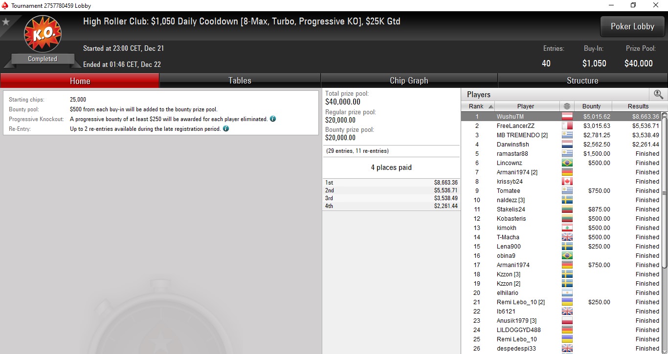 Beim nächtlichen $530 Supersonic sollte es erneut einen Cash für „WushuTM“ geben. Auf Platz 9 erhielt er $1.742,21, der Sieg aber ging an den Brasilianer Victor “VICTOR TXR1” Teixeira für $11.080,05. Bei Teixeria kann man auch von einem Lauf sprechen, konnte er doch bereits gestern das Supersonic gewinnen ($9.901,80).
