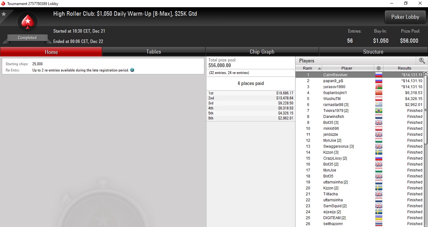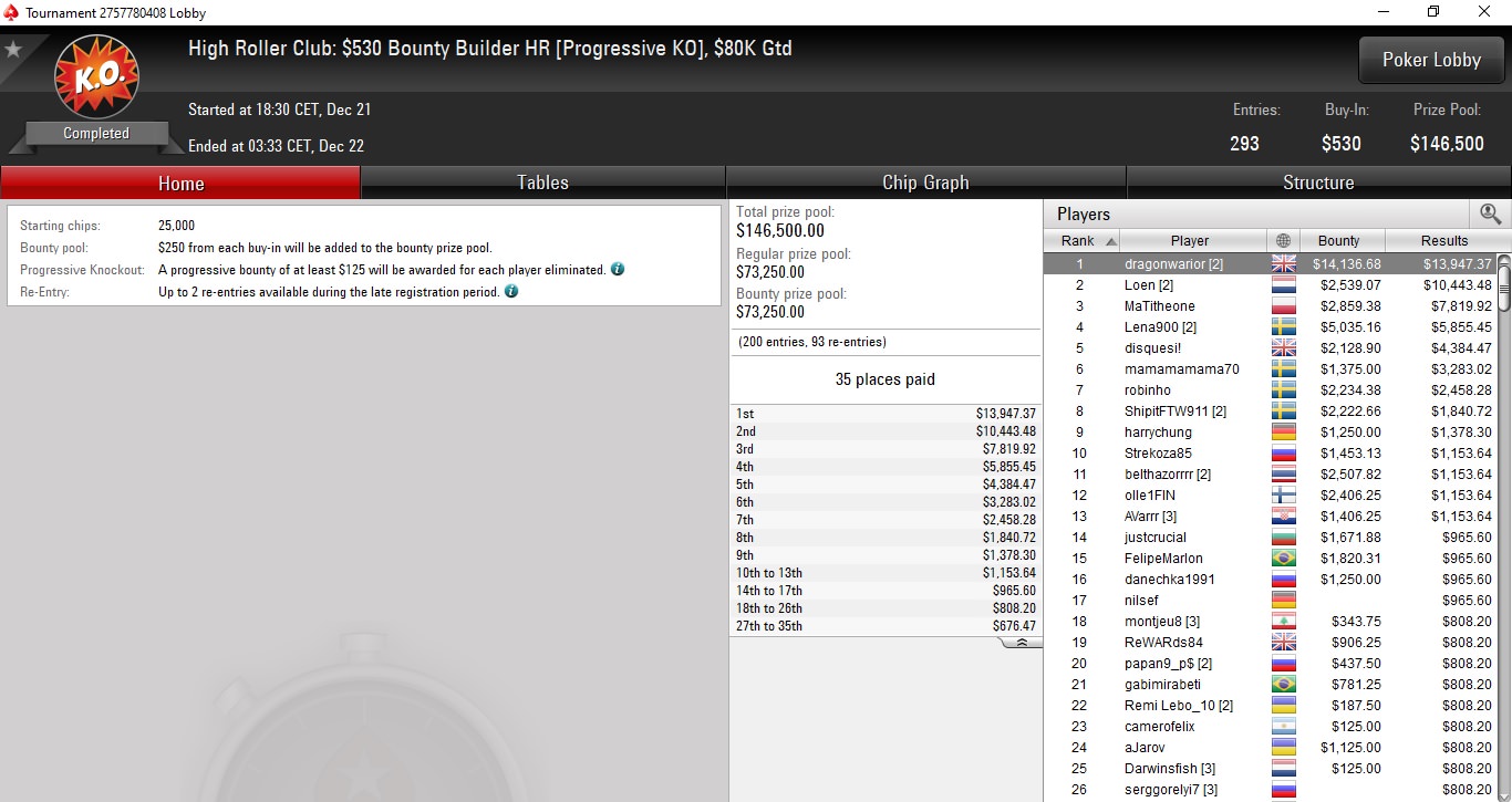 Beim größten Turnier des Abends, dem $530 Bounty Builder HR sorgten 293 Entries für einen Preispool von $146.500. Der Sieg ging an den Wahl-Briten „dragonwarior“, der für seinen Erfolg $28.084,05 seinem PokerStars Konto hinzufügen darf.