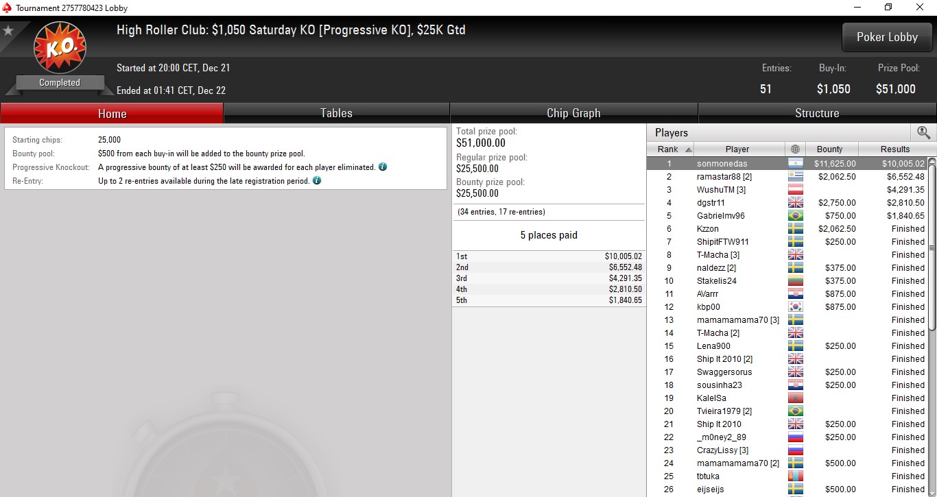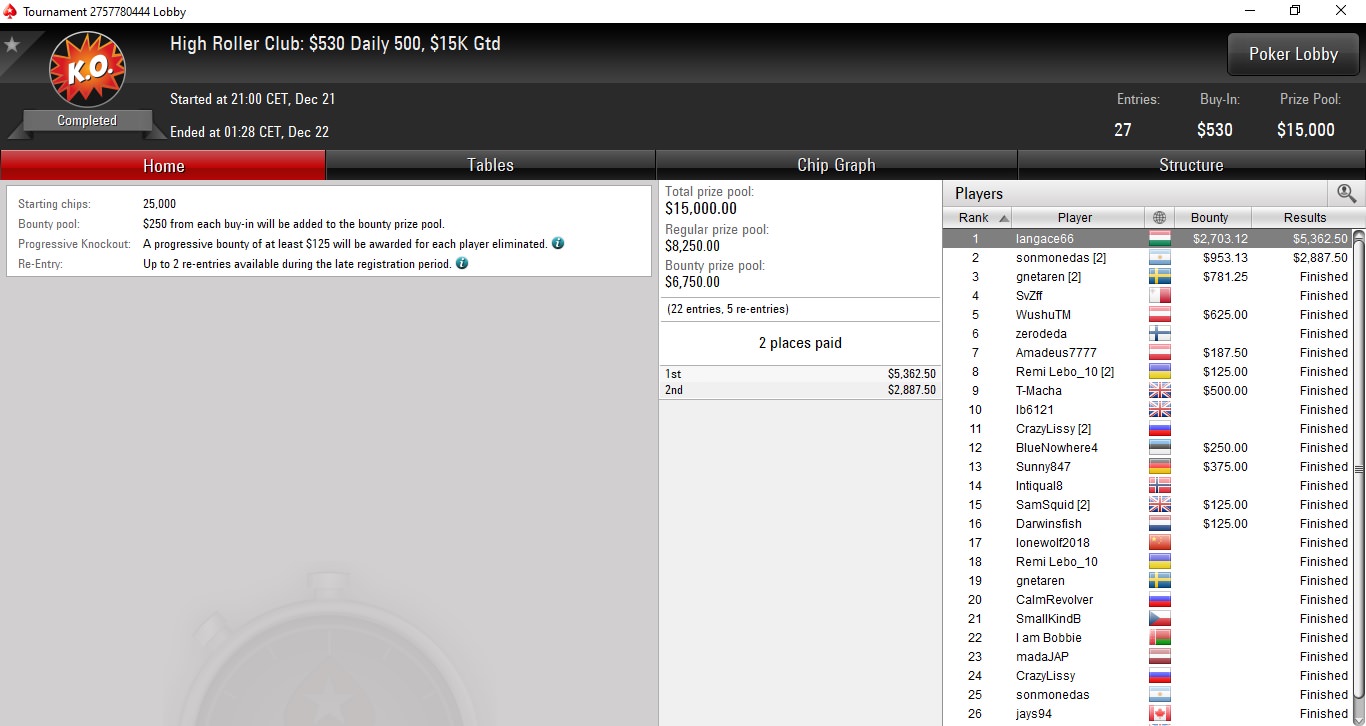 Beim $530 Daily 500 sollten nur die Top 2 bezahlt werden. Hier schaffte es Thomas Mühlöcker immerhin $625 an Bountys zu gewinnen. Rodrigo „sonmonedas“ Perez ($3.840,63) schaffte es erneut ins Heads-Up musste sich dann aber dem Ungarn „langace66“ geschlagen geben ($8.065,62).