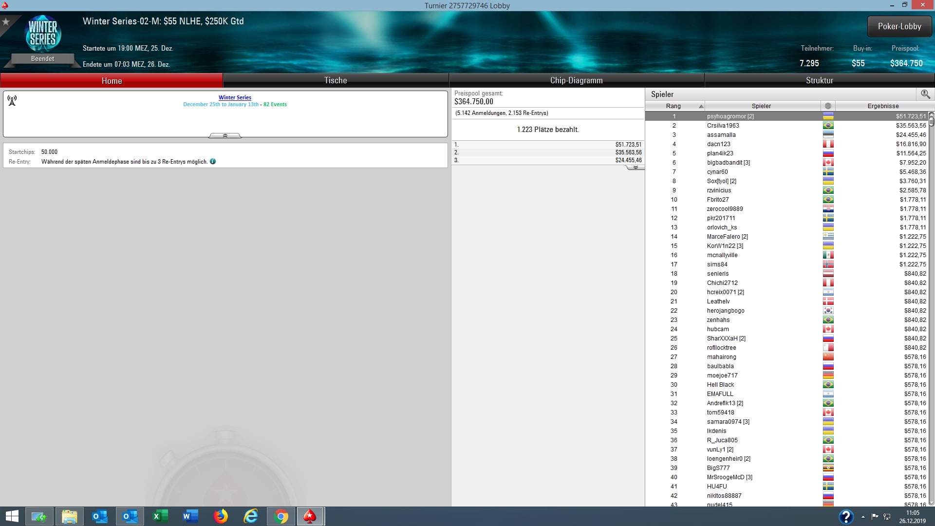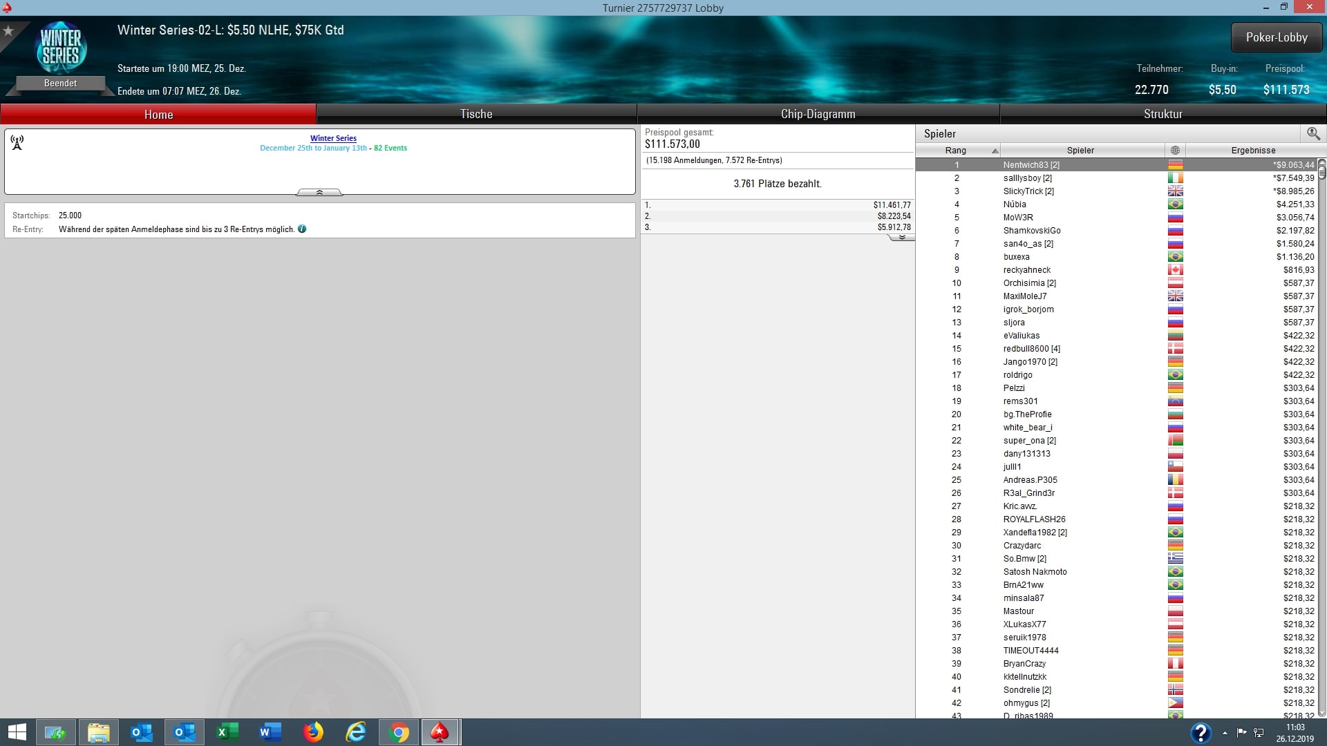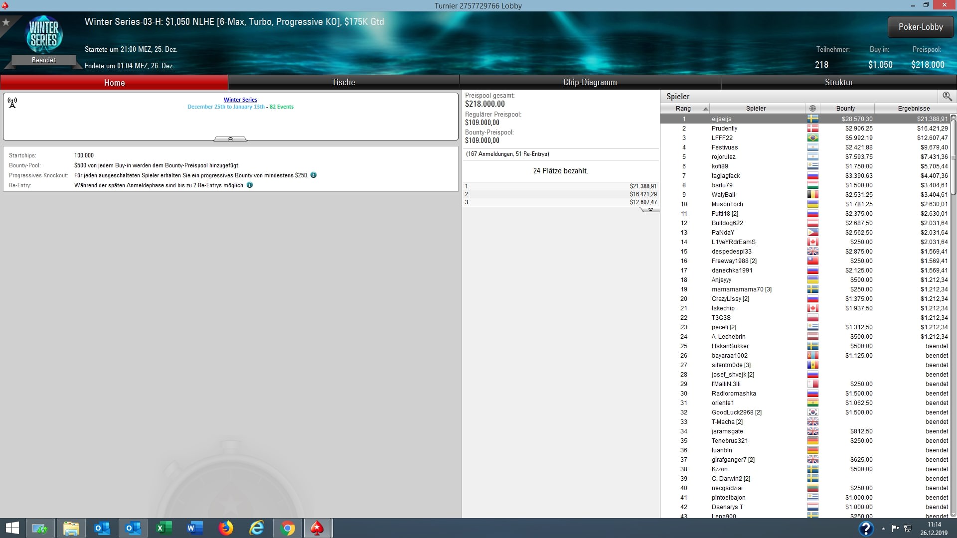 Auf Pokerstars startete am ersten Weihnachtsfeiertag die Winter Series. Am Tag 1 standen sechs Entscheidungen an. Das Event #1 ist ein $109 Phase Turnier mit $2.500.000 garantiert, dass erst am 12. Januar 2020 entschieden wird. Bei den sechs Turnieren durfte man 45.669 Entries verbuchen und die Garantiesumme von insgesamt $1.025.000, wurde mit $1.364.578 deutlich überschritten.