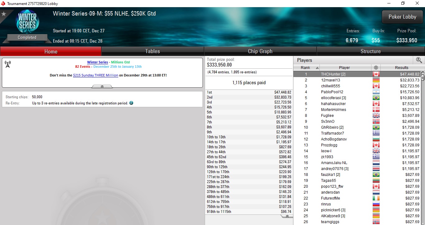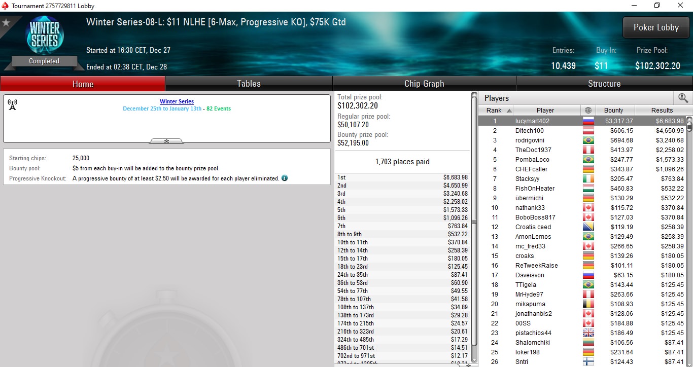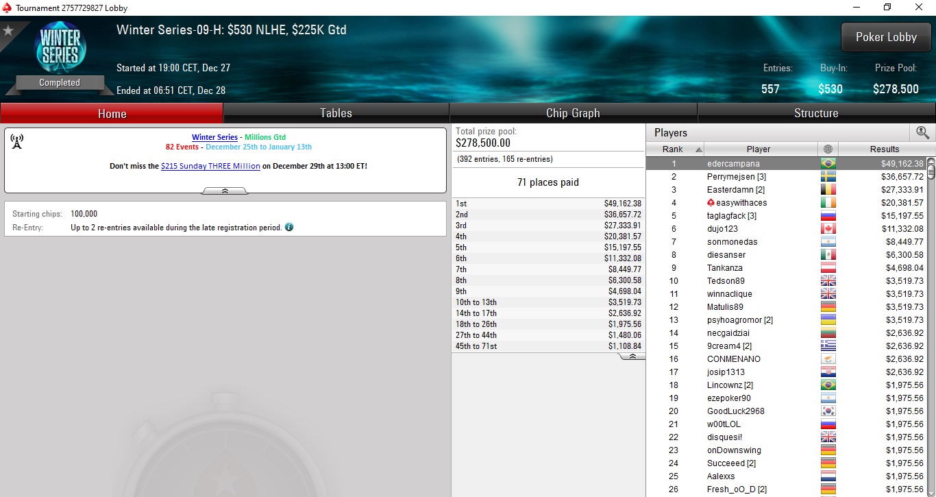 Die Ergebnisse der Winter Series auf PokerStars vom 27.12.2019: