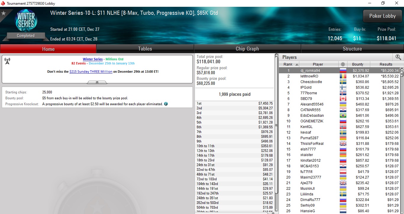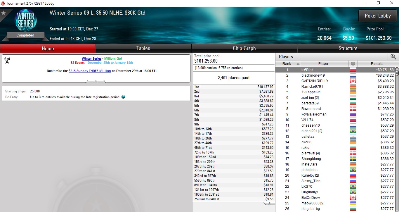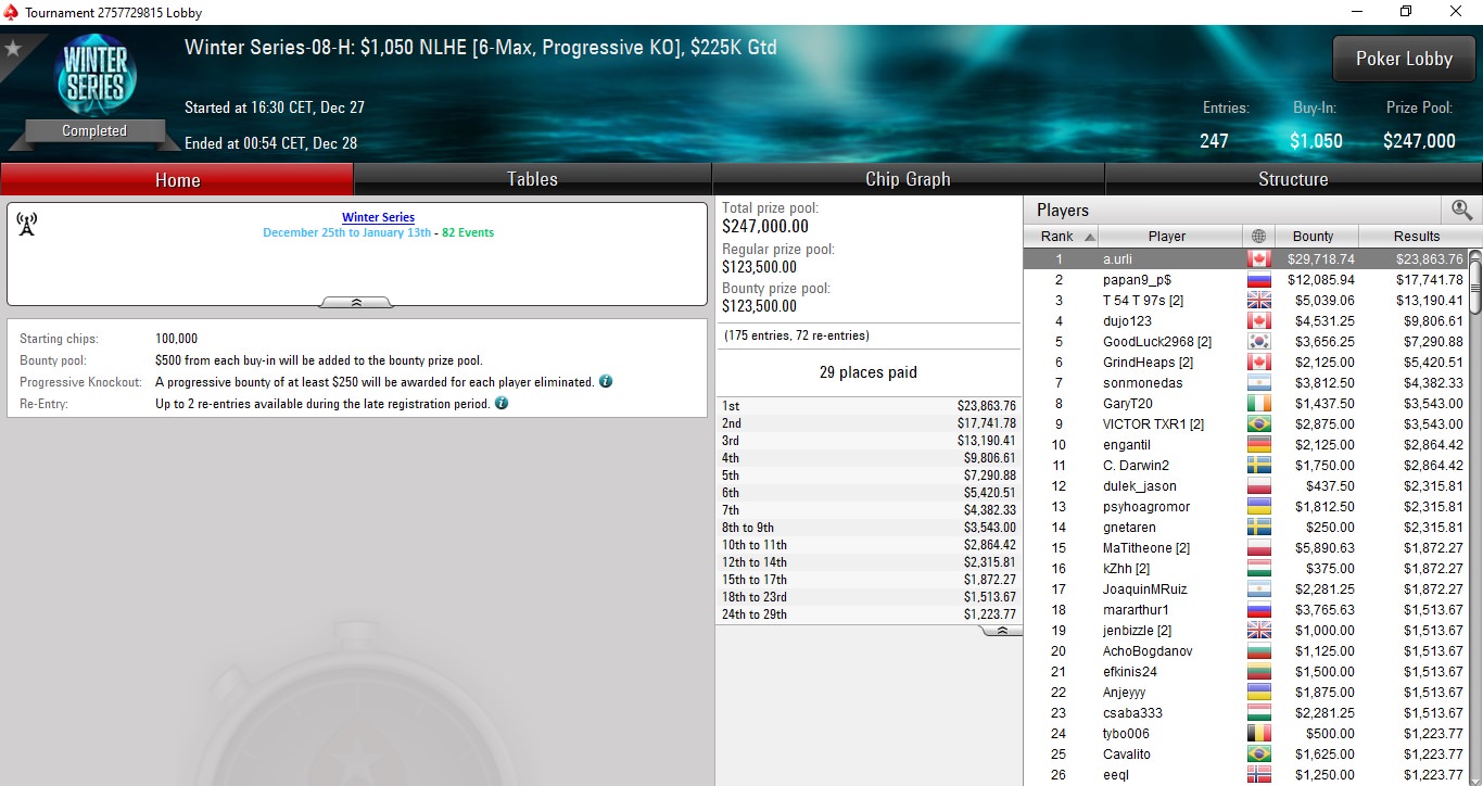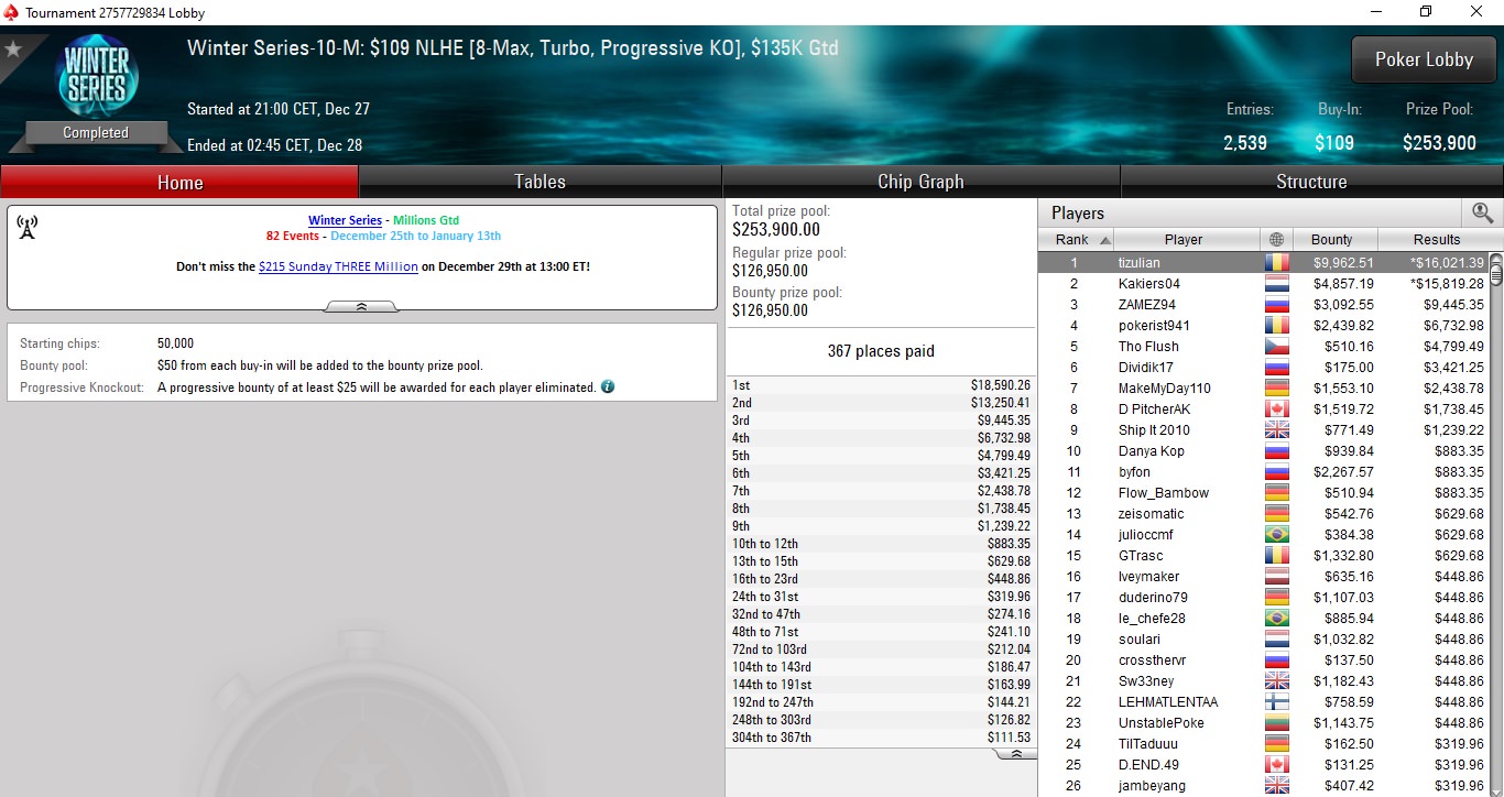 Die Ergebnisse der Winter Series auf PokerStars vom 27.12.2019: