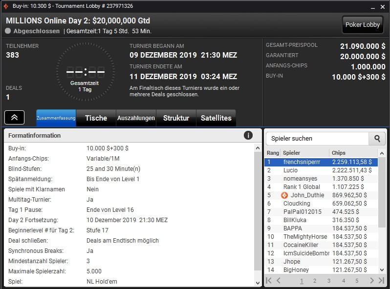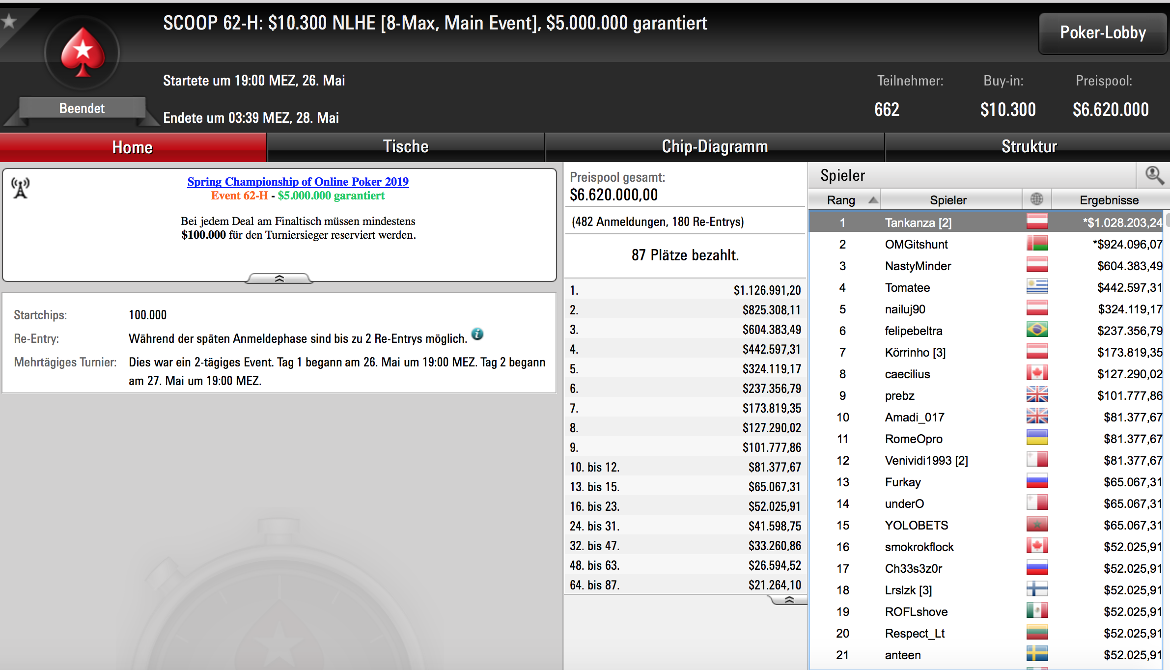 Während die DACH-Spieler mit dem neunten Platz von „moglimiranda“ zufrieden sein mussten, konnte der Brite „BigBlindBets“ jubeln.