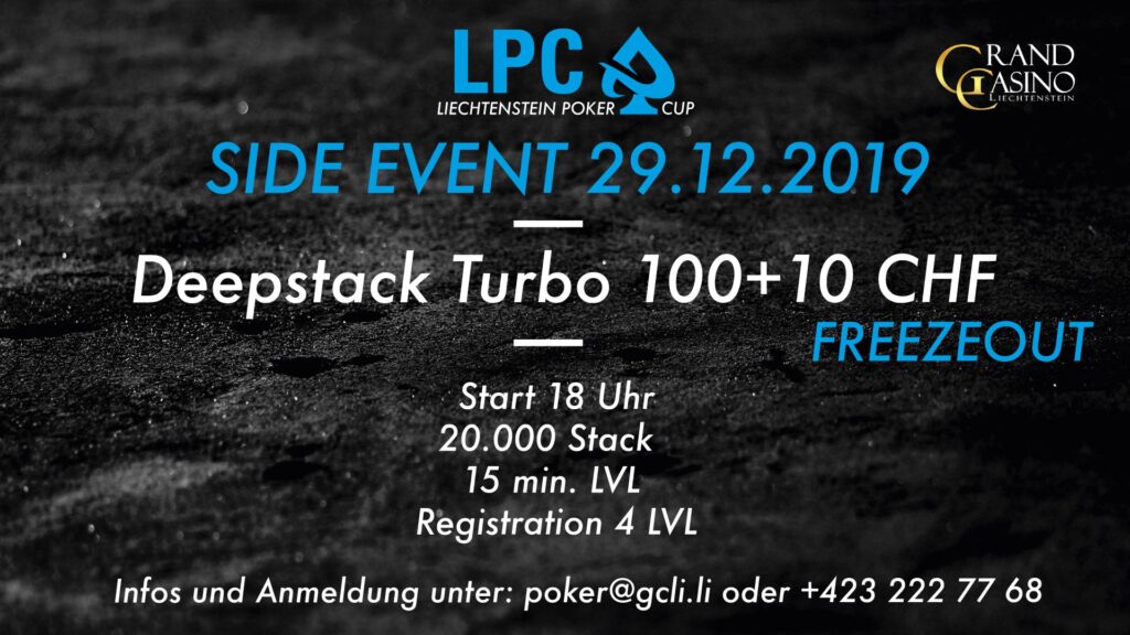 Um 18:00 startet zudem noch ein Side-Event für CHF110. Bei dem DeepStack Turbo wird mit 20.000 Startstack und 15 Minuten Level gespielt. Alle Interessierten sollten sich dafür vorab anmelden, da die Plätze begehrt und begrenzt sind.