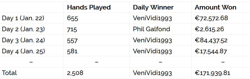 So verliefen die bisherigen vier Sessions zwischen Phil Galfond und „VeniVidi1993“: