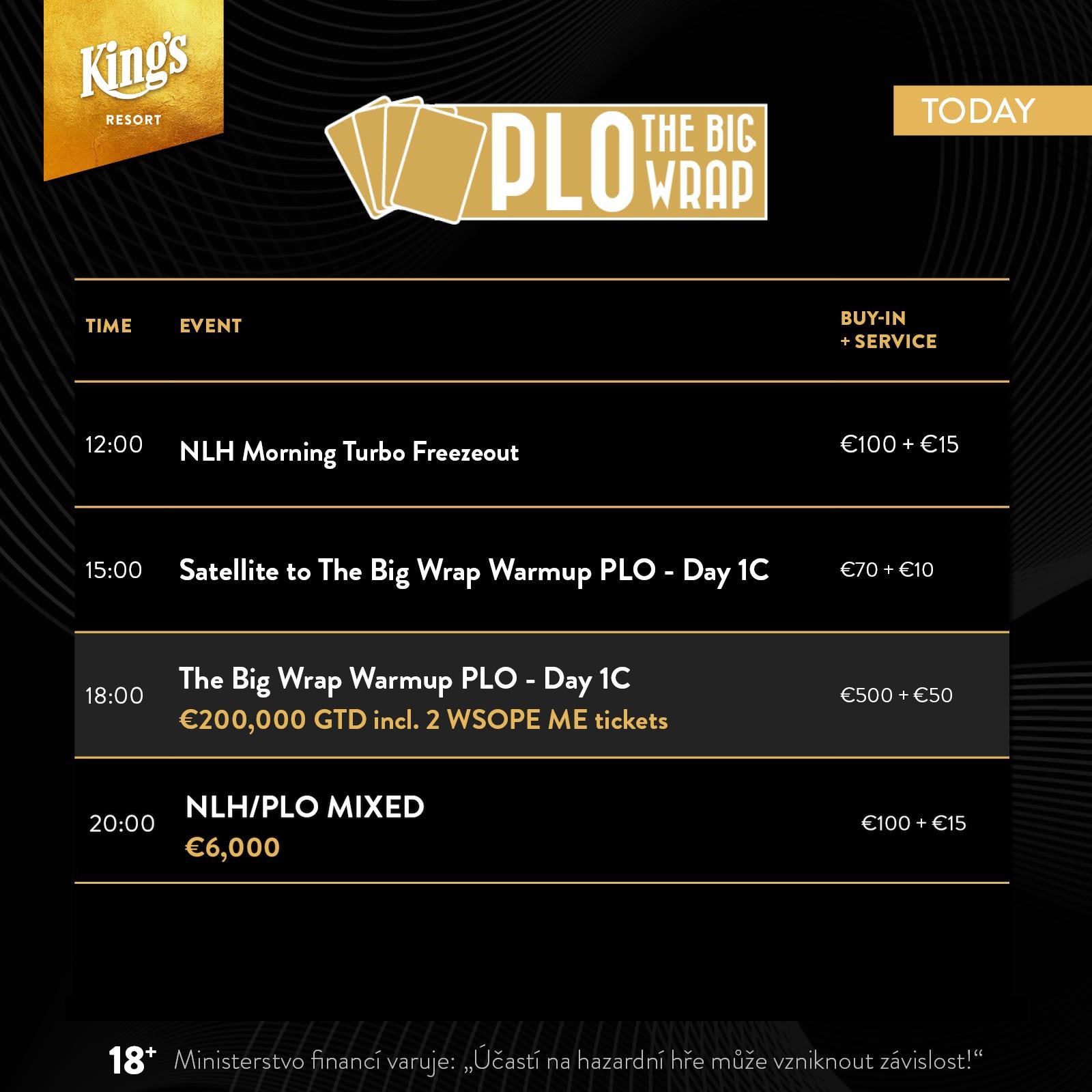Der Tag 1c des €500+€50 „The Big Wrap Warm Up“ PLO Events startet um 18:00 Uhr. Bei dem Turnier wird ein Preisgeld von €200.000 (inklusive zwei €10.350 WSOP Europe 2020 Tag 1a Main Event Tickets) garantiert. Es geht los mit 30.000 in Chips und es werden 14 Level à 30 Minuten gespielt. Es sind unlimited Re-Entries erlaubt und die Late-Registration ist bis zum Start von Level 11 geöffnet. Der Tag 2 findet am Donnerstag ab 15:30 Uhr statt. Der Sieger wird erst im Finale am Freitag ab 14:00 Uhr ermittelt. Am Freitagabend gibt es auch einen Livestream vom Finale.