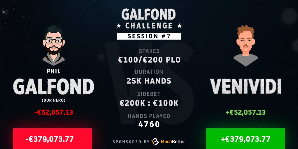 Knapp €380.000 ist er nun im Rückstand gegen VENIVIDI. Für Phil Galfond soll der Start der Galfond-Challenge einfach nicht laufen. In der gestrigen Session verlor er wieder stark, dieses mal €52.057,13. Das Duell gegen VENIVIDI ist aber auch gerade einmal ein Fünftel seiner Zeit gelaufen. Von 25.000 Händen, die die Beiden insgesamt spielen werden, sind erst 4.760 gespielt. Mehr als genug Raum für Galfond seine knapp 40 Buy-Ins Miese wieder zu begradigen.