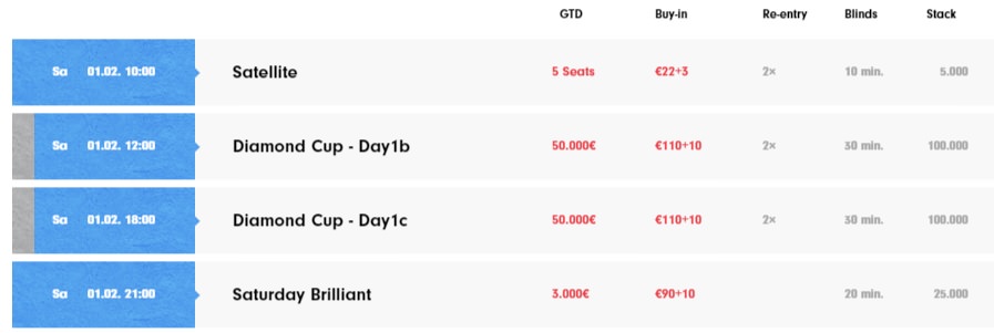 Neben reichlicher Turnieraction laufen auch jeden Tag heiße Cash Games. Es geht bereits los mit Blinds von €1/€1. Alle weiteren Informationen zum Diamond Cup und weiteren Angeboten im Grand Casino Aš könnt ihr der Homepage des Casinos entnehmen.