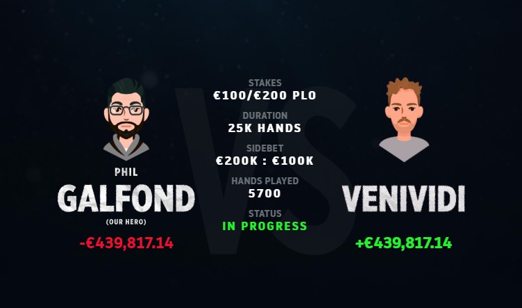 Nach eindrucksvollen 940 gespielten Händen verlor er €60.743,37 und steht bei einem Gesamtverlust von €439.817,14. Die halbe Million-Marke ist somit im nächsten Match in greifbarer Nähe für „VeniVidi1993“. Es sind zwar erst 5.700 Hände, der vereinbarten 25.000 Hände, gespielt und noch viel kann passieren, jedoch kann man sich kaum vorstellen, dass Phil Galfond das Blatt noch einmal wenden kann.
