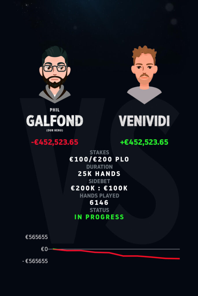 An Tag 9 der Challenge sah es anfangs gut aus. Zwischenzeitlich war Galfond fast €60.000 vorne. „VeniVidi1993“ ließ sich aber nicht aus der Ruhe bringen und zwang Phil konsequent sein Spiel auf. Am Ende gewann „VeniVidi1993“ in 446 Händen €12.706,51. Nach insgesamt 6146 von geplanten 25.000 Händen liegt Galfond nun bereits €452.523,65 zurück. Es kann noch alles passieren, denn es ist nun erst knapp ein Viertel der Challenge gespielt. Jedoch ist es nach aktuellem Maße sehr unwahrscheinlich, dass Galfond das Blatt bei diesen herben Verlusten noch einmal wenden kann.