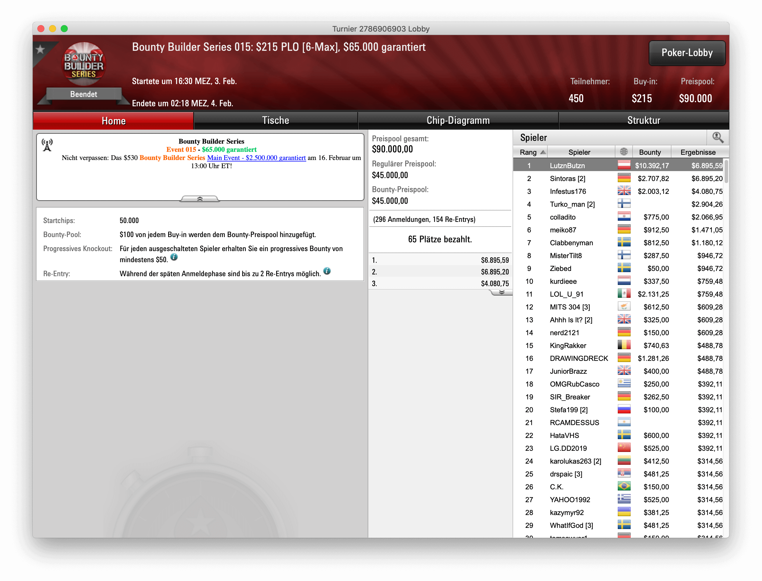 Auch Pot Limit Omaha gibt es bei der Bounty Builder Series. Event 15 war ein $215 6-MAX Plo, bei dem $65.000 garantiert wurden. Insgesamt 296 Spieler sorgten für 450 Entries, wodurch ein Preispool von glatten $90.000 entstanden. Am Ende schnappte sich der Österreicher „LutznButzn“ den Sieg für $6.895,59 und machte $10.392,17 mit Bounties. Auf Rang 2 landet ein deutscher Online-Highrolle. „Sintoras“ bekommt für seinen zweiten Platz $6.895,20 und macht $2.707,82 mit Bounties.