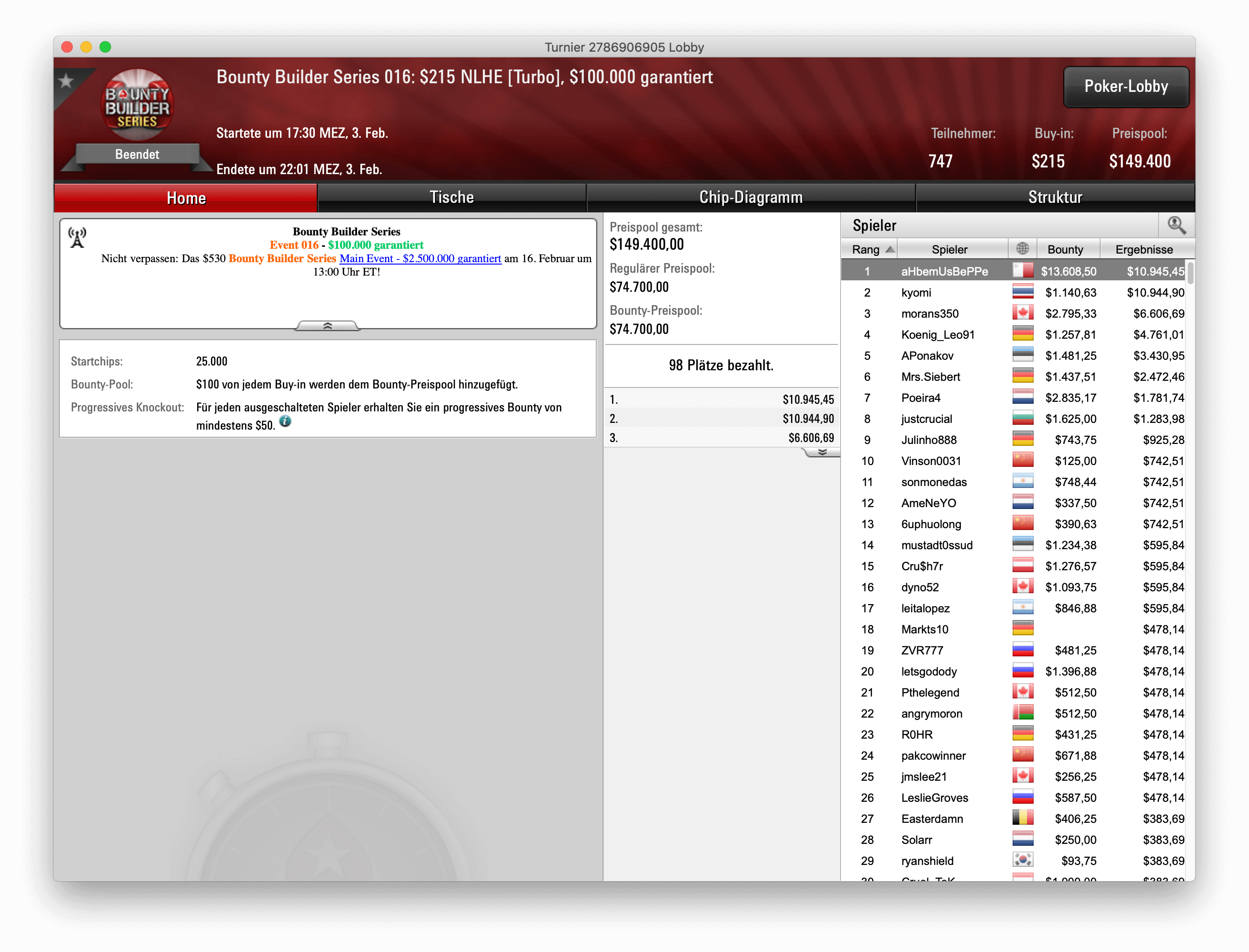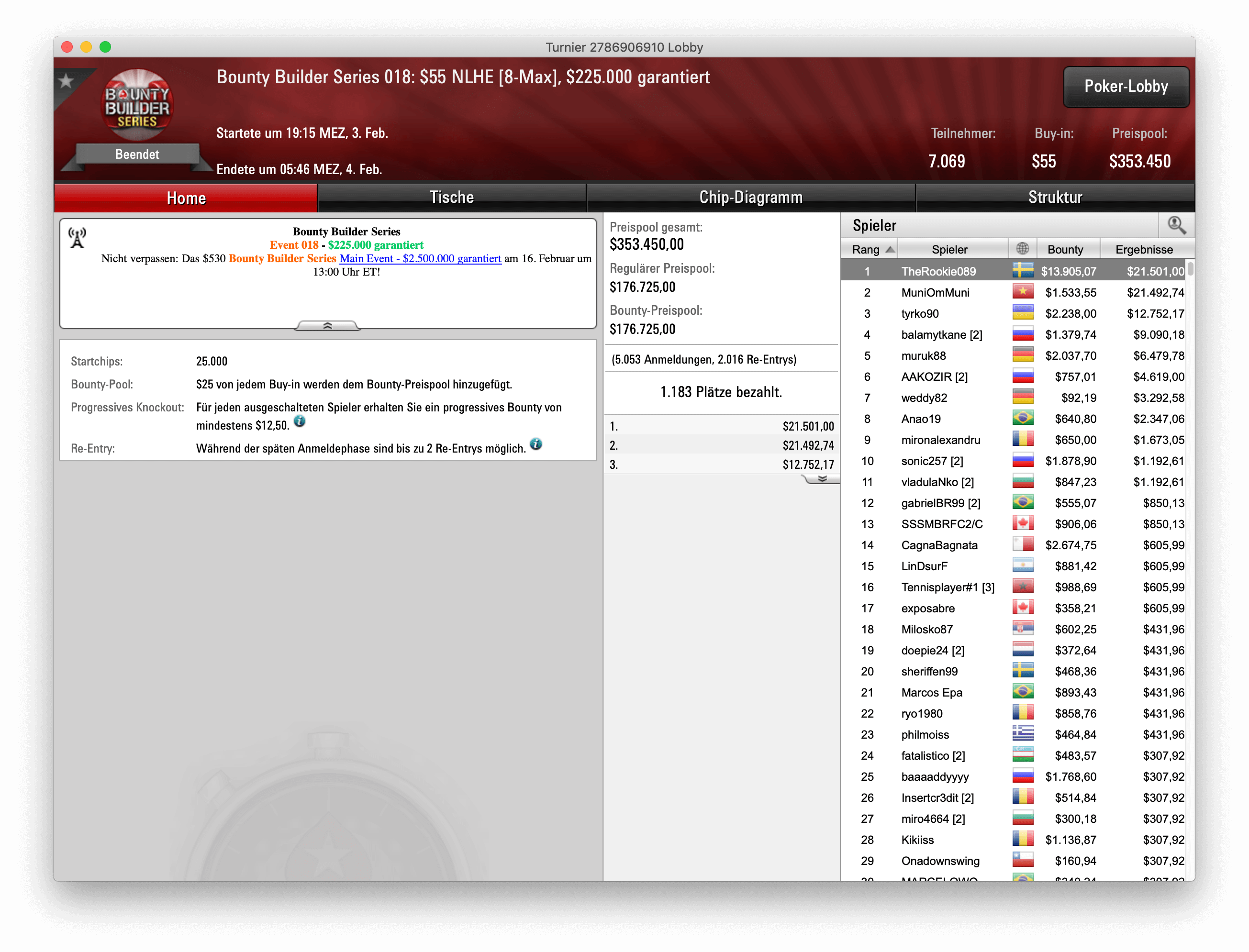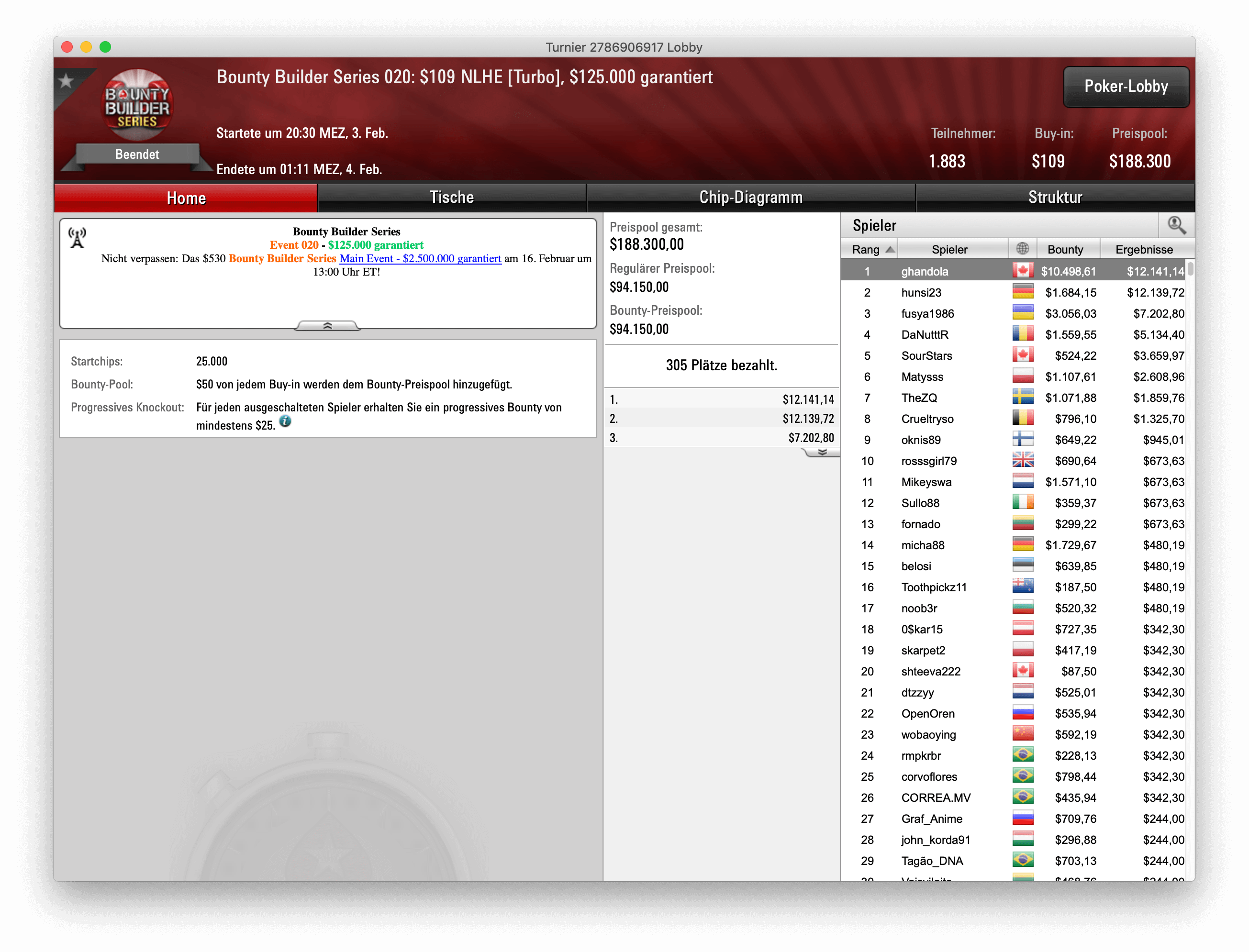 Turnier 20 der Bounty Builder Series ludt Spieler zu einem NLHE-Turbo für $109 ein. 1.883 Entries kamen zustanden, womit der Preispool mit $188.300 die Garantie von $125.000 locker knackte. Den Sieg errung am Ende der Kanadier „ghandola“ für knapp $22,6k für Platzierung und Bounties. Als Runner-Up konnte sich der Deutsche „hunsi23“ platzieren, er bekam für seinen Rang $12.139,72 und machte mit Bounties vergleichbar geringe $1.684,15.