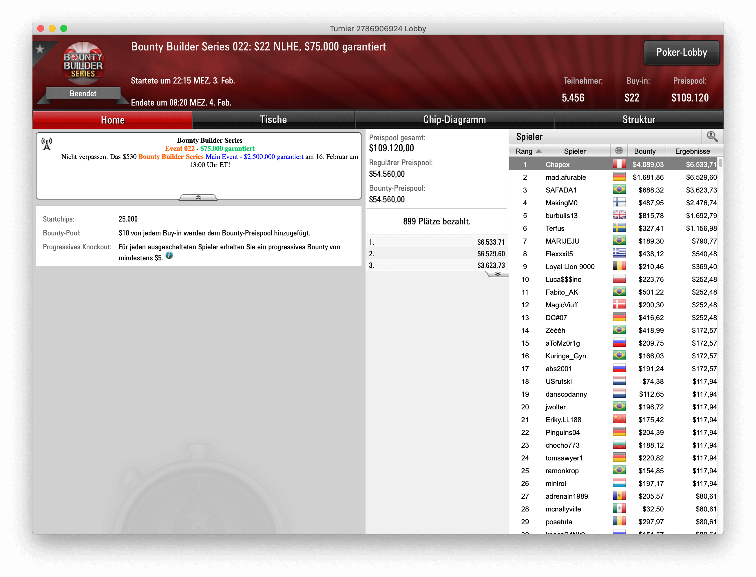 $22 kostete das Buy-In des Turniers Nummer 22 der Serie. $75.000 wurden garantiert. Durch 5.456 Entries wurde diese Garantie locker geknackt, der Preispool lag bei $109.120. Als Sieger konnte sich der Peruaner „Chapex“ durchsetzen, der mit Bounties $4.089,03 verdiente und für seinen ersten Platz $6.533,71 bekommt. Als Runner-Up platzierte sich der Deutsche „mad.afurable“, der für Platz 2 $6.529,60 bekommt und $1.681,86 mit Bounties gewann.